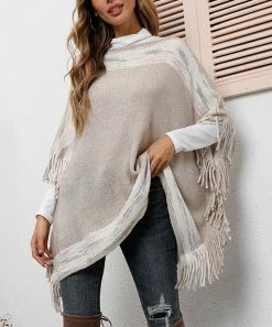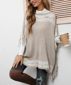 Cozy up on cool weather days in the roomy design of this poncho sweater boasting acrylic-blend fabric and a boho-inspired fringe accent.