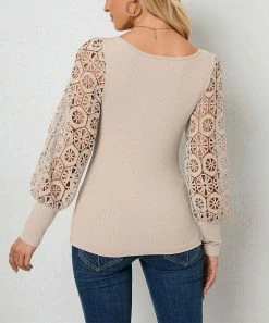 This elegant top features a flattering scoop neckline with sheer lace embellishments on the lantern sleeves.