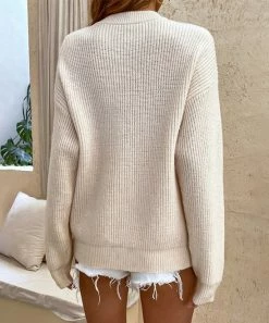 Solid-color ribbed-knit sweater featuring long sleeves and a button-front collar.