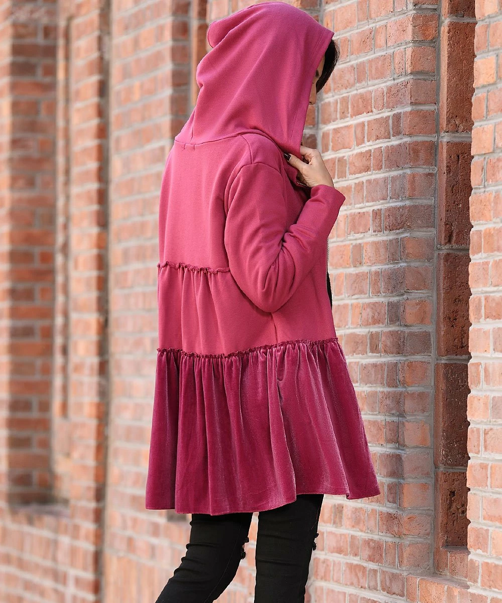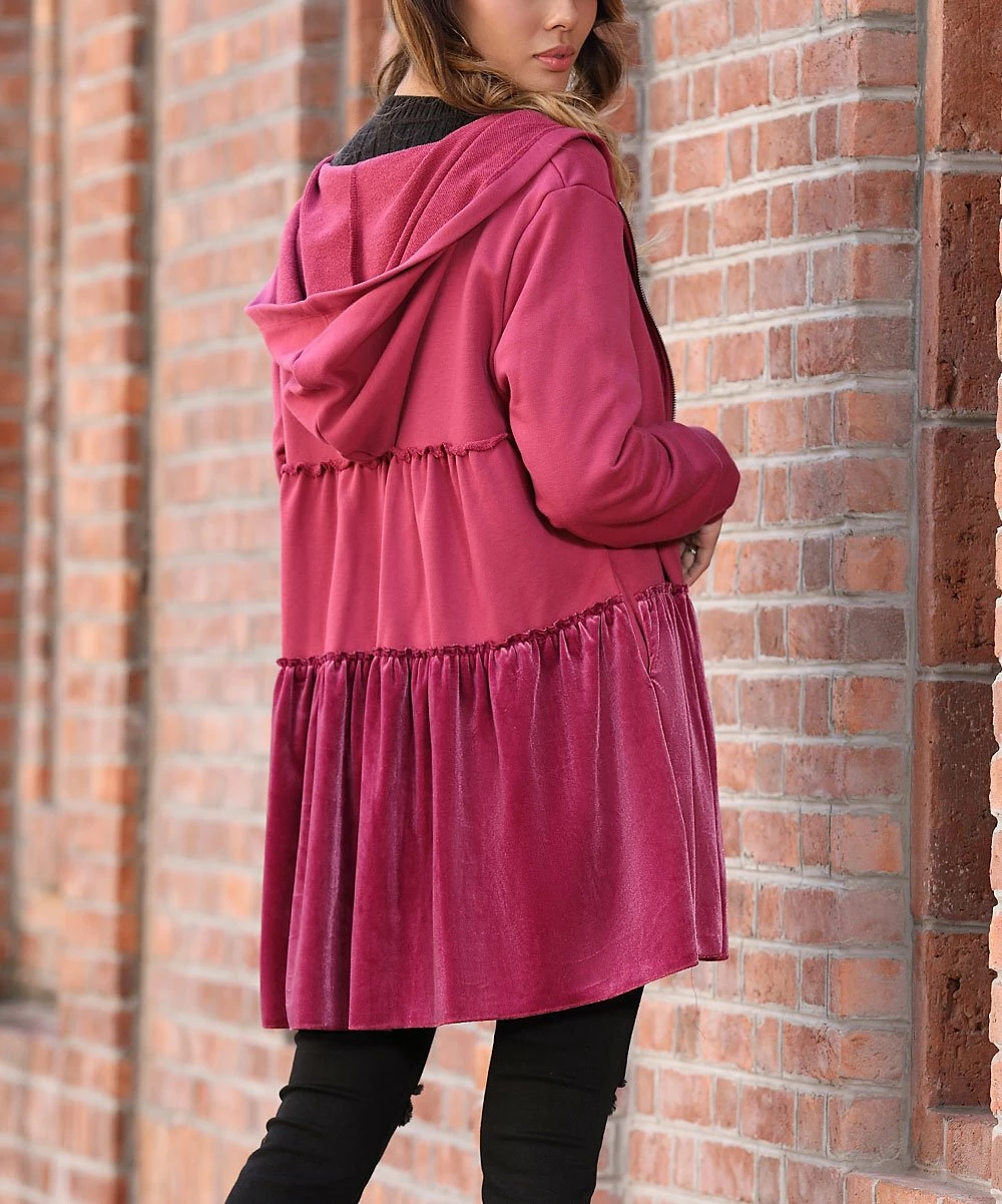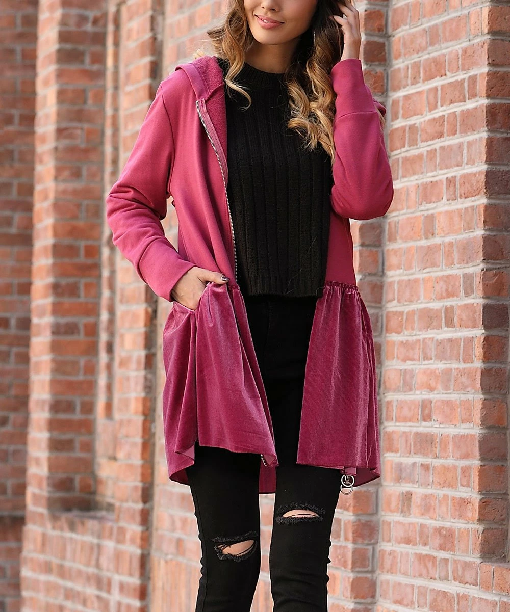 Enrich your cold season wardrobe with this unique zip-up hoodie featuring a ruffle-hem and a two way, ring-hole zipper.