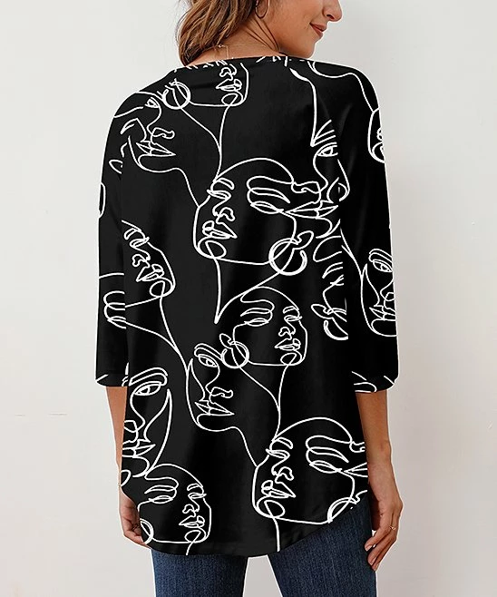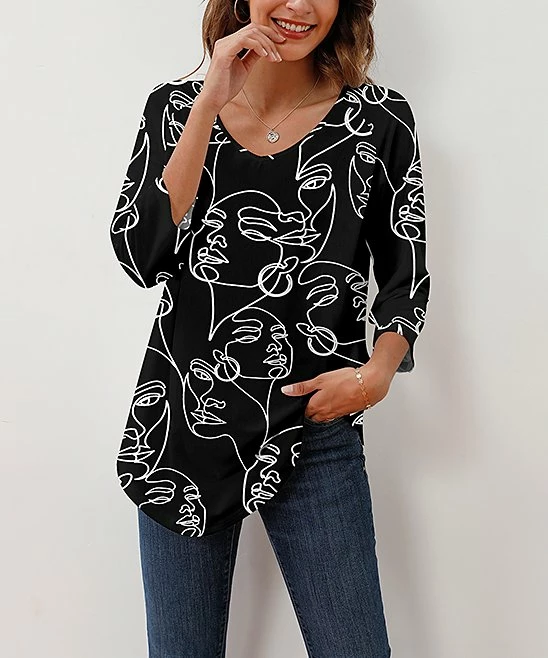Exude chic style in this tunic that features a loose-fitting design and three-quarter sleeves. Its artful motif makes the top an eye-catching addition to your casual wardrobe.