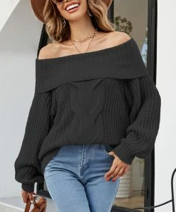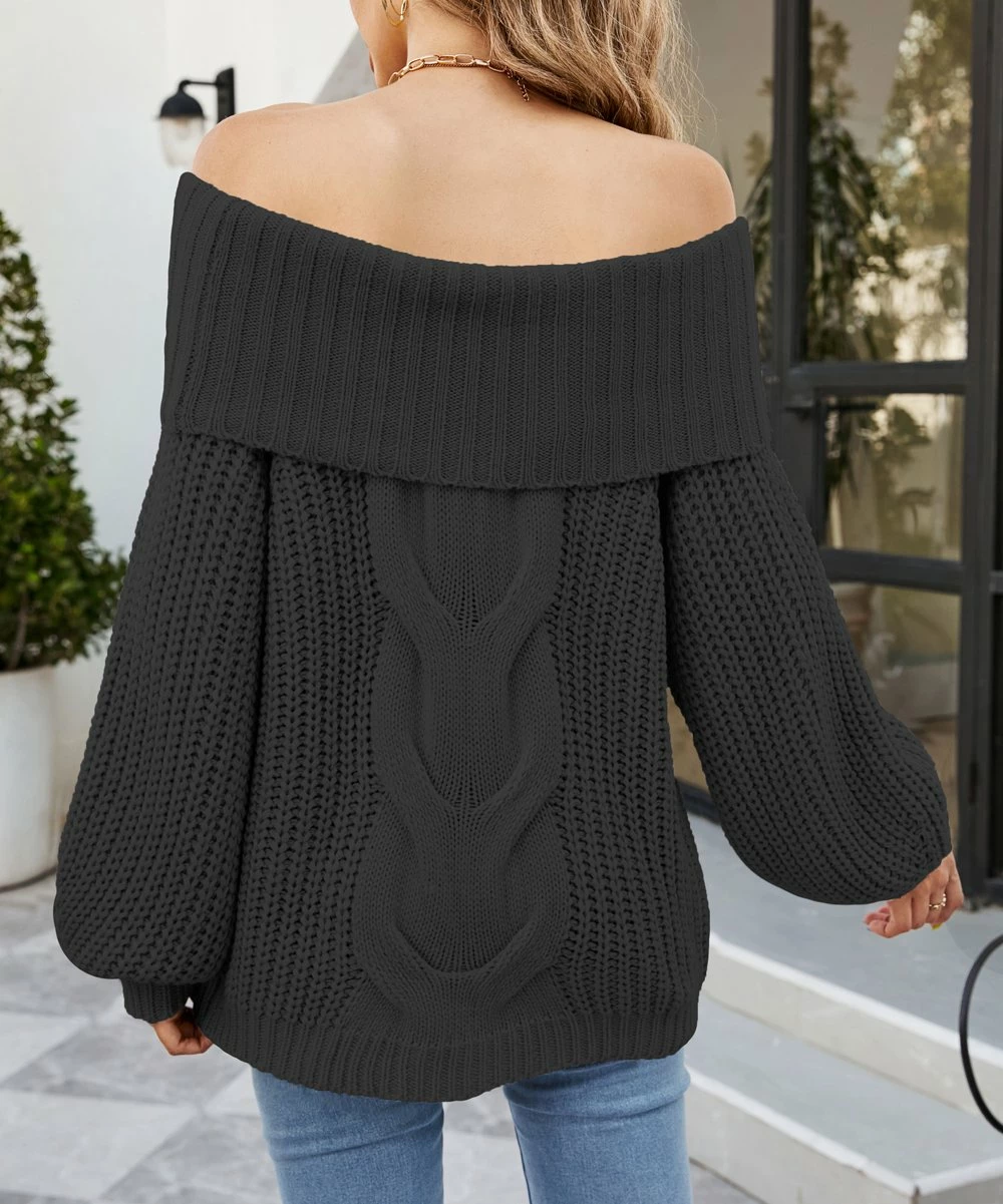 Solid-color cable-knit sweater featuring long slouchy sleeves and an off-shoulder design.