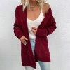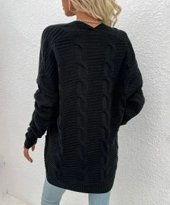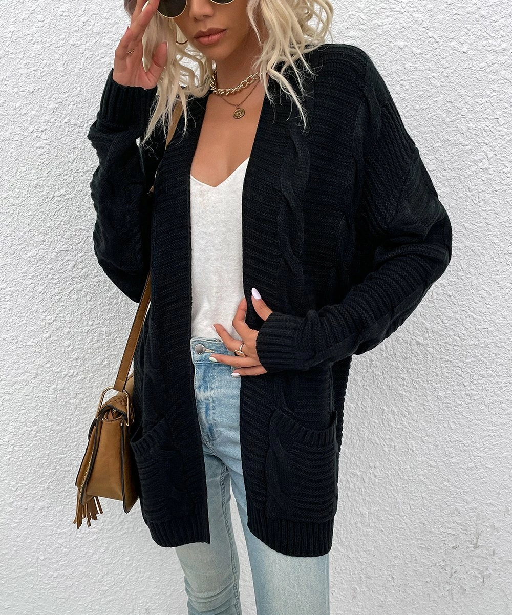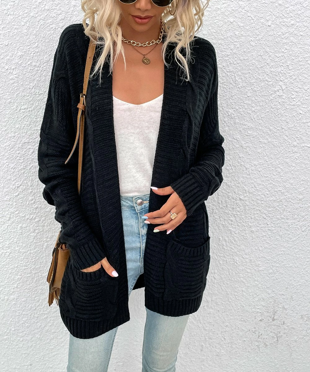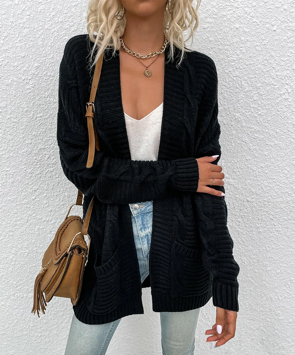 Casual solid-color open cardigan featuring a cable-knit design and front pockets.