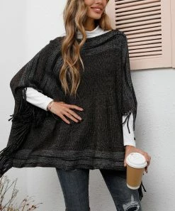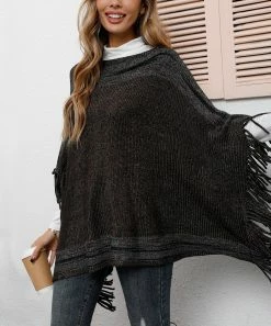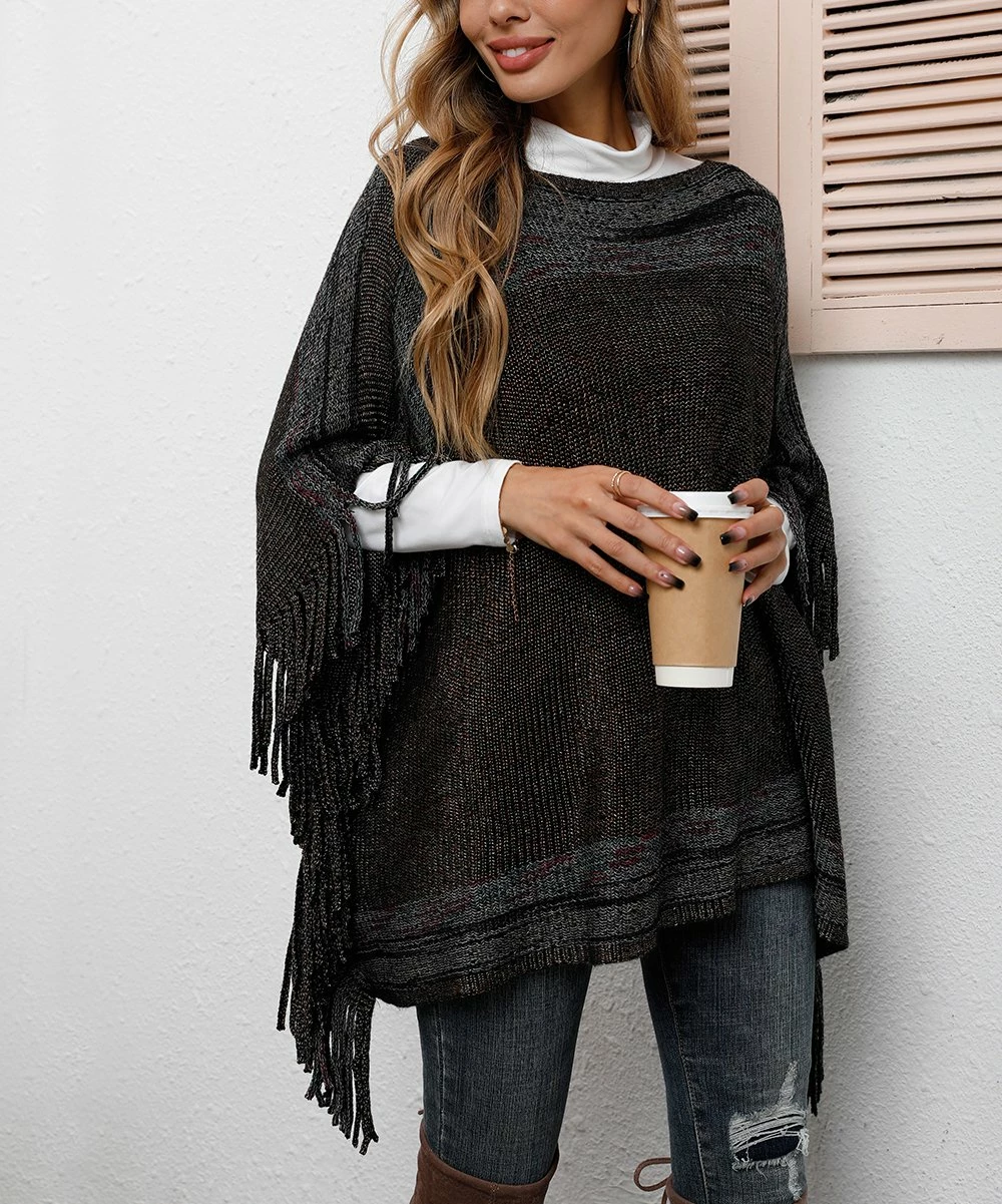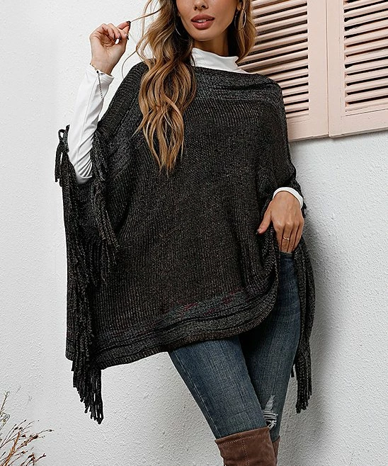 Cozy up on cool weather days in the roomy design of this poncho sweater boasting acrylic-blend fabric and a boho-inspired fringe accent.