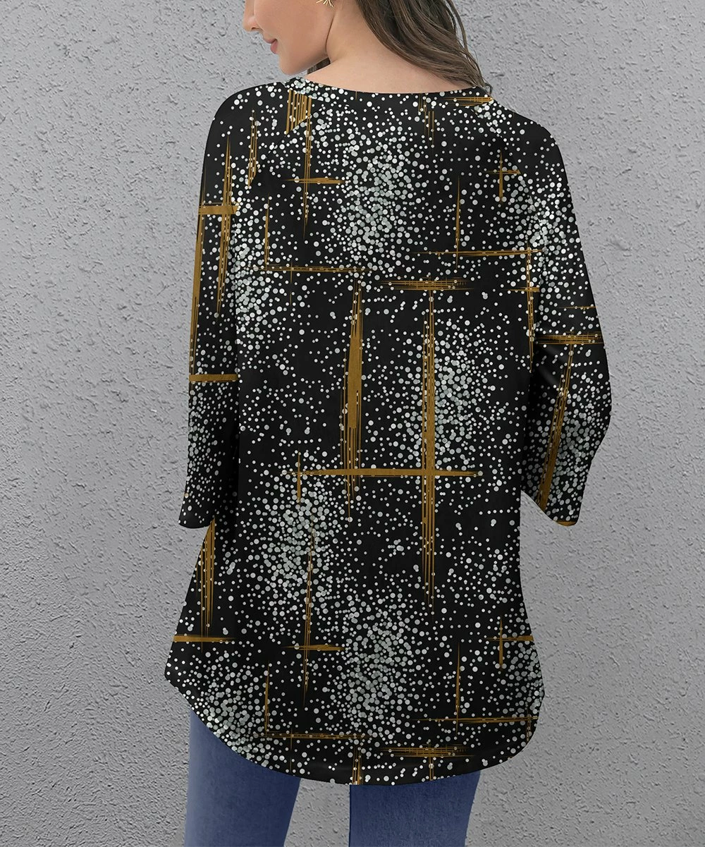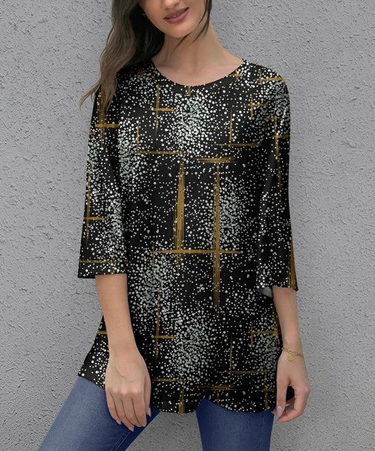 Elevate your wardrobe in this colorful tunic featuring an abstract print and three-quarter length sleeves.