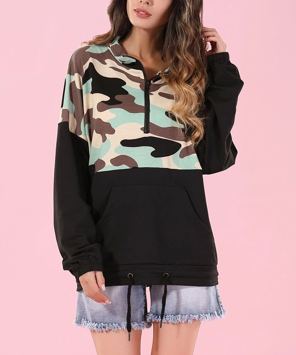 Stay sneakily and stylishly warm on chilly nights in this half-zip pullover embellished with a hand-stashing kangaroo pocket and stretch-enhanced fabric.