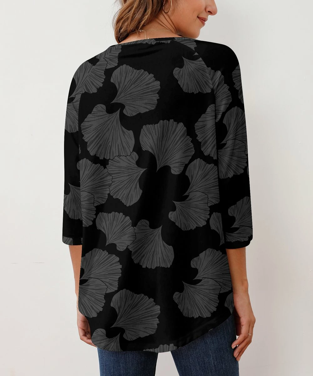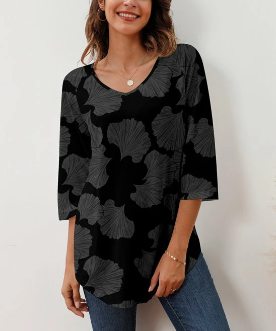 Step up your style with this tunic featuring a statement pattern and graceful round hem. Stretch-blend material keeps it feeling comfy and three-quarter length sleeves give you just-right coverage.