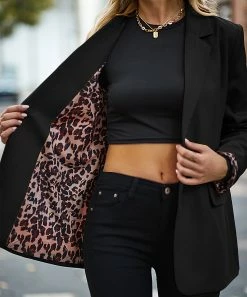 This classic blazer is updated with a fun leopard print lining that can be revealed by turning up cuffs. Flap pockets.