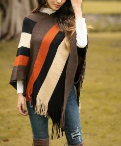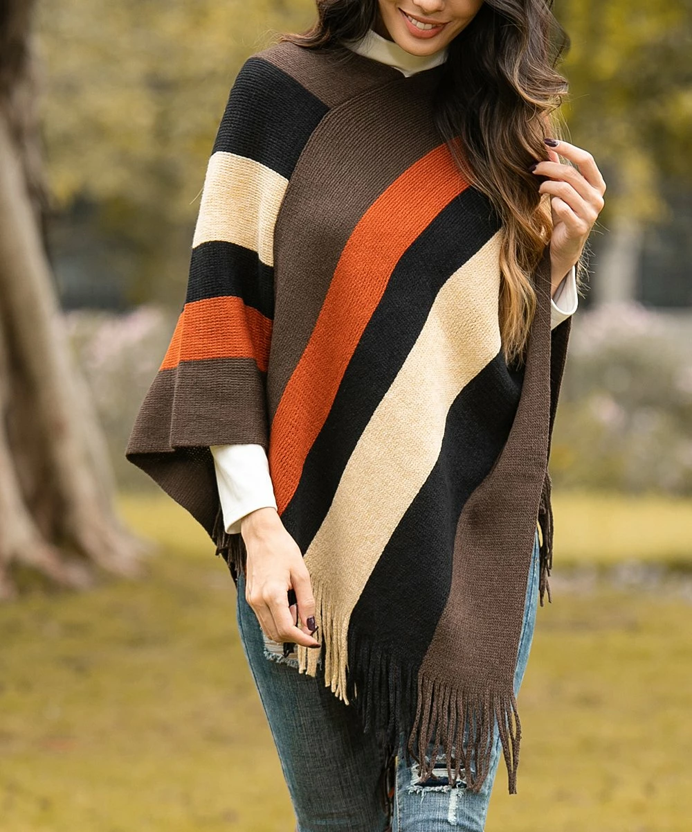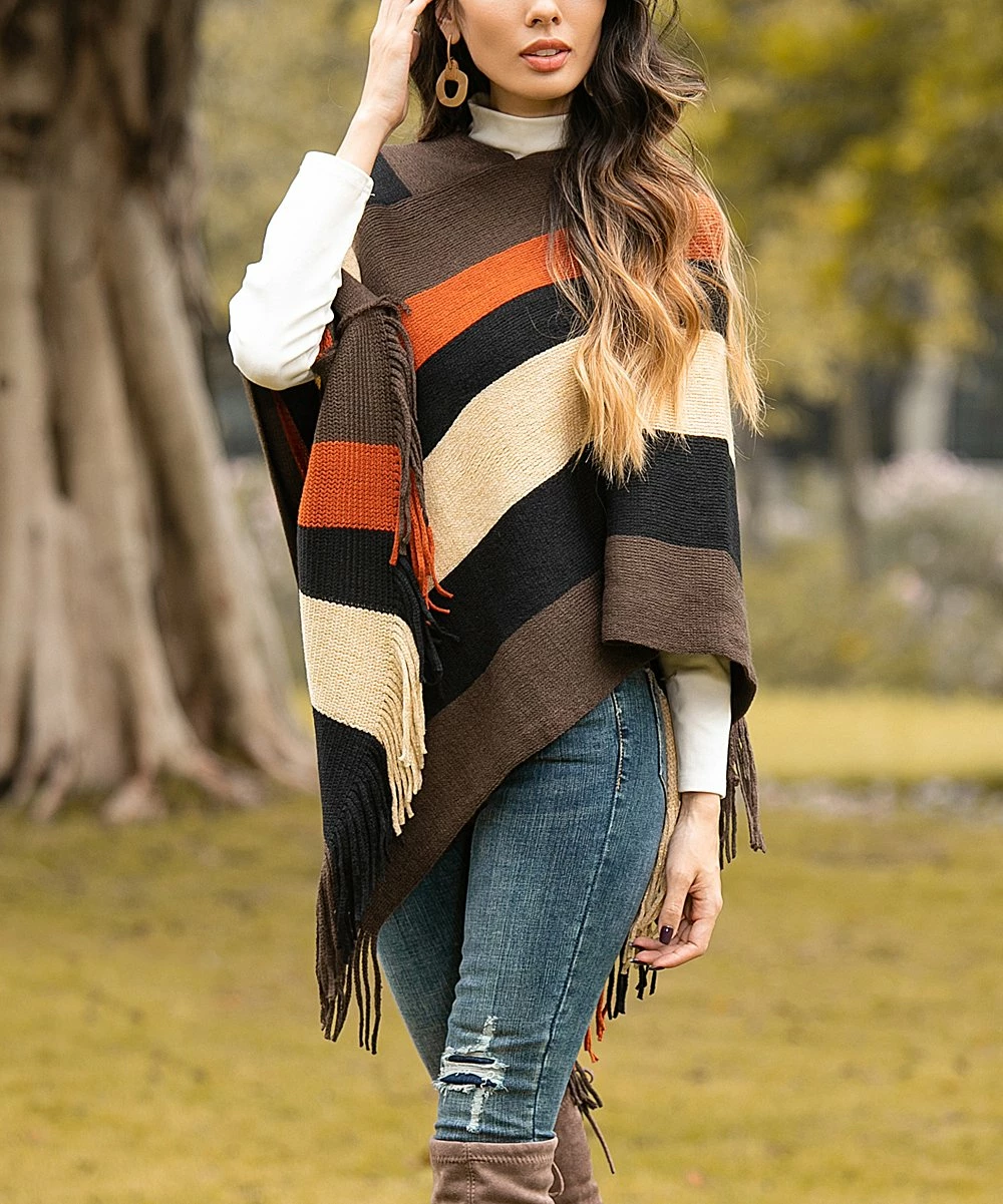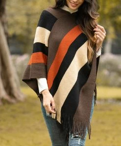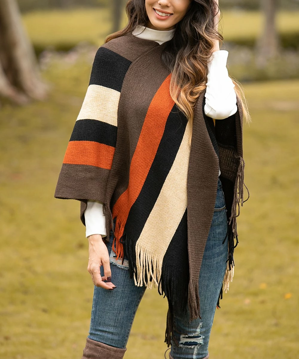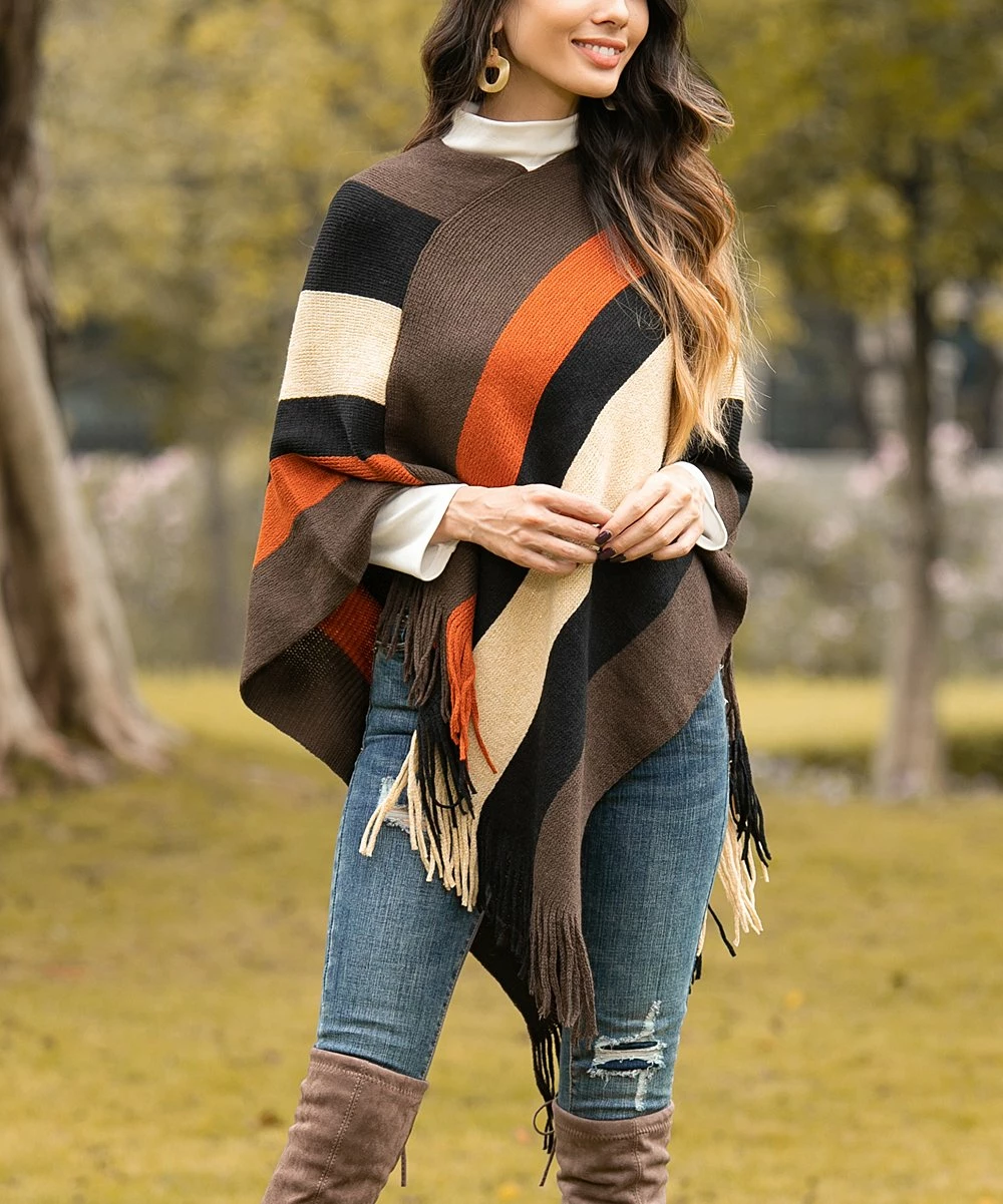 Freshen up your cool-weather layers with this vibrant striped poncho detailed with fringe flair that offers a soft textured touch as you stroll.