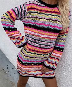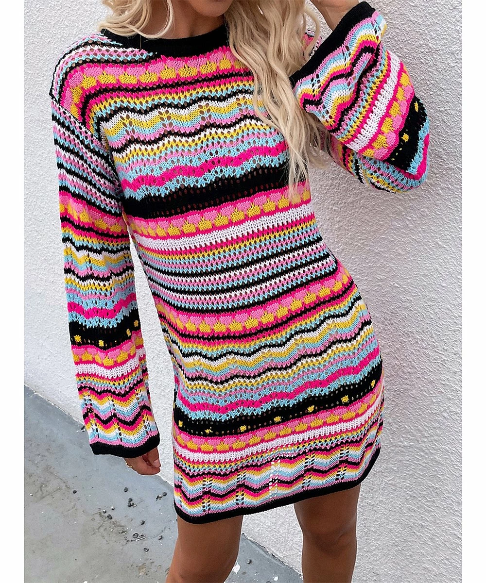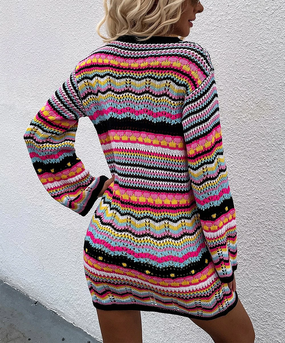 Give your wardrobe a groovy upgrade with this colorful crochet dress sporting flowing bell sleeves.