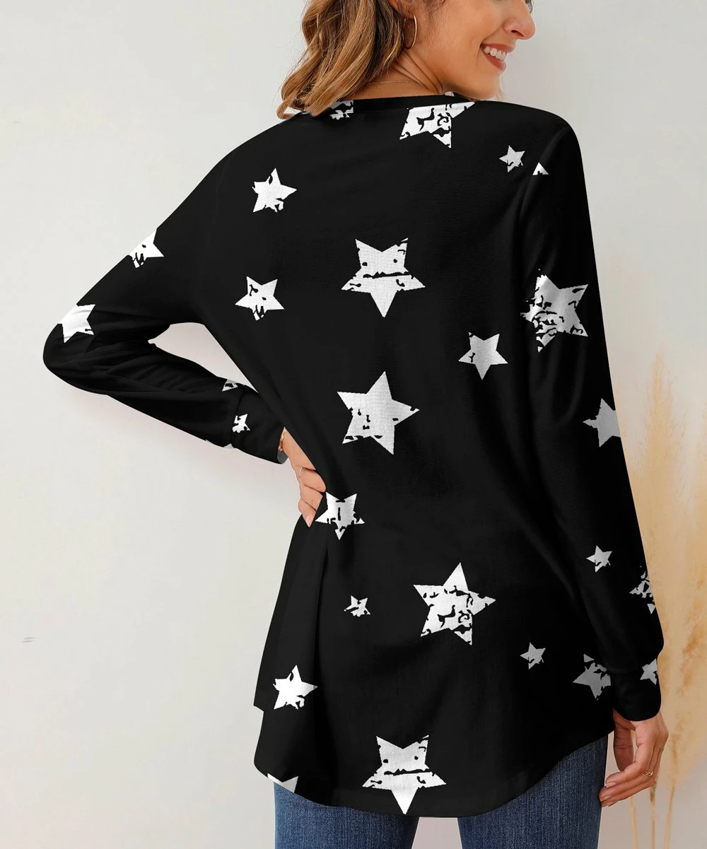 Enliven your everyday style with this tunic featuring cozy long sleeves and a statement pattern. Button accents add a poised finish to the v-neckline.