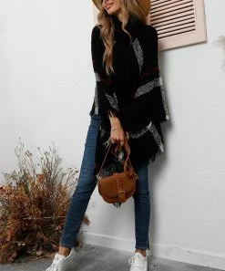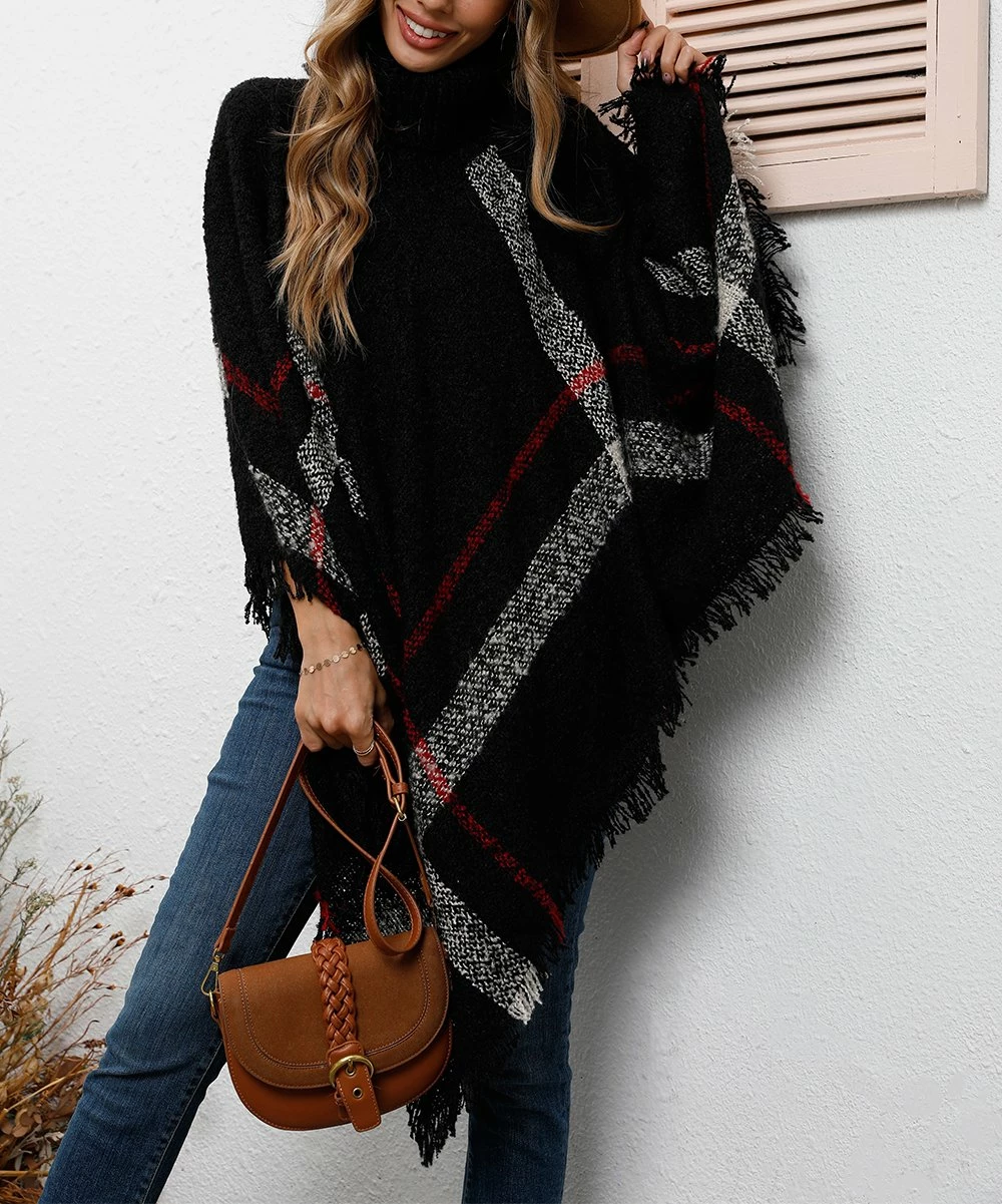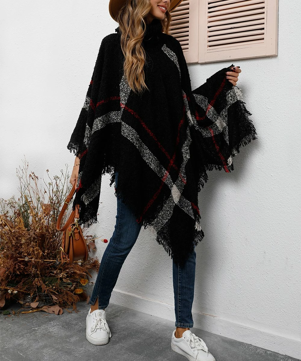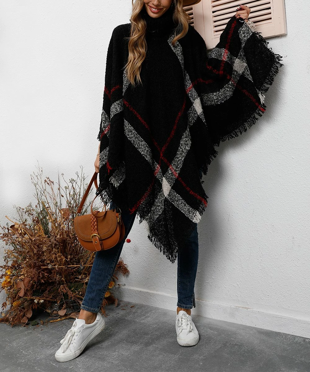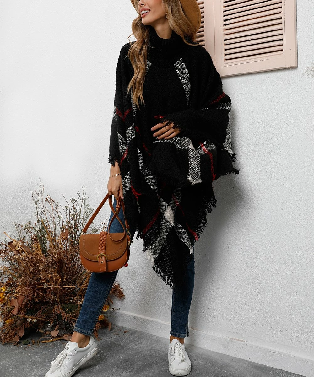 When there’s a chill in the air, this cotton-blend poncho’s high turtleneck and blanket-like fringe keep your street style on point.
