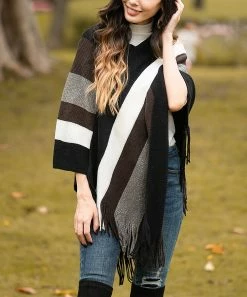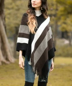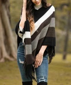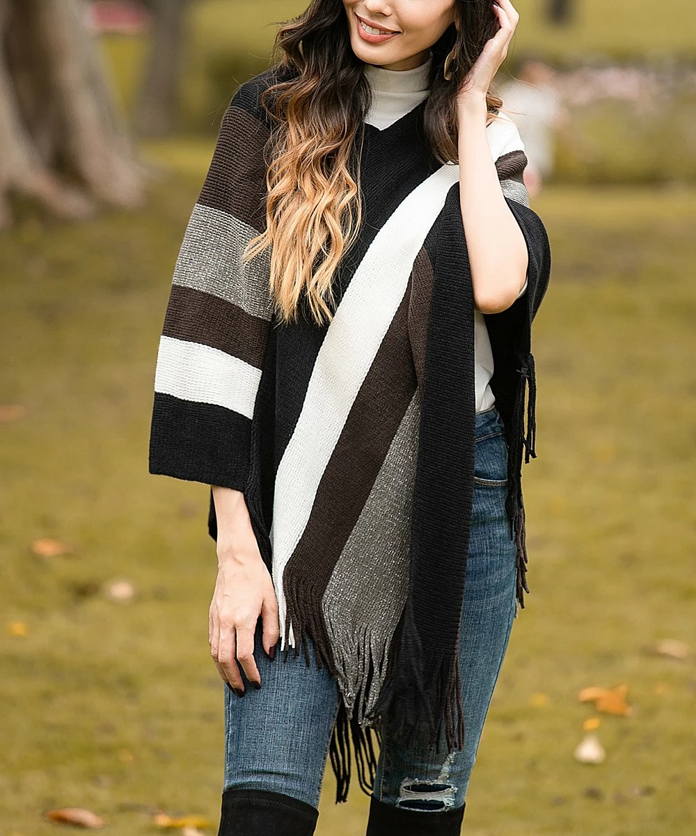 Freshen up your cool-weather layers with this vibrant striped poncho detailed with fringe flair that offers a soft textured touch as you stroll.