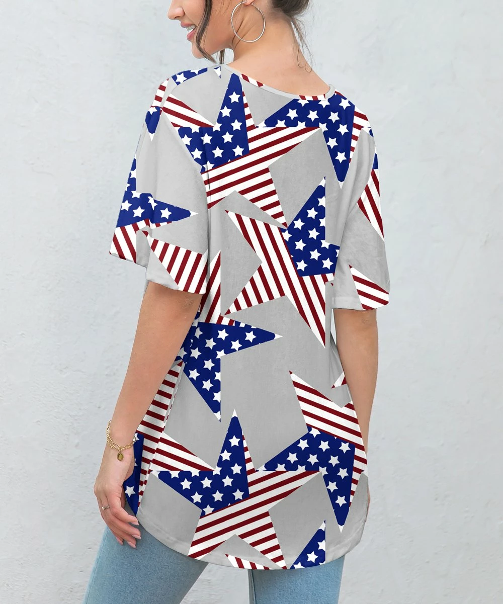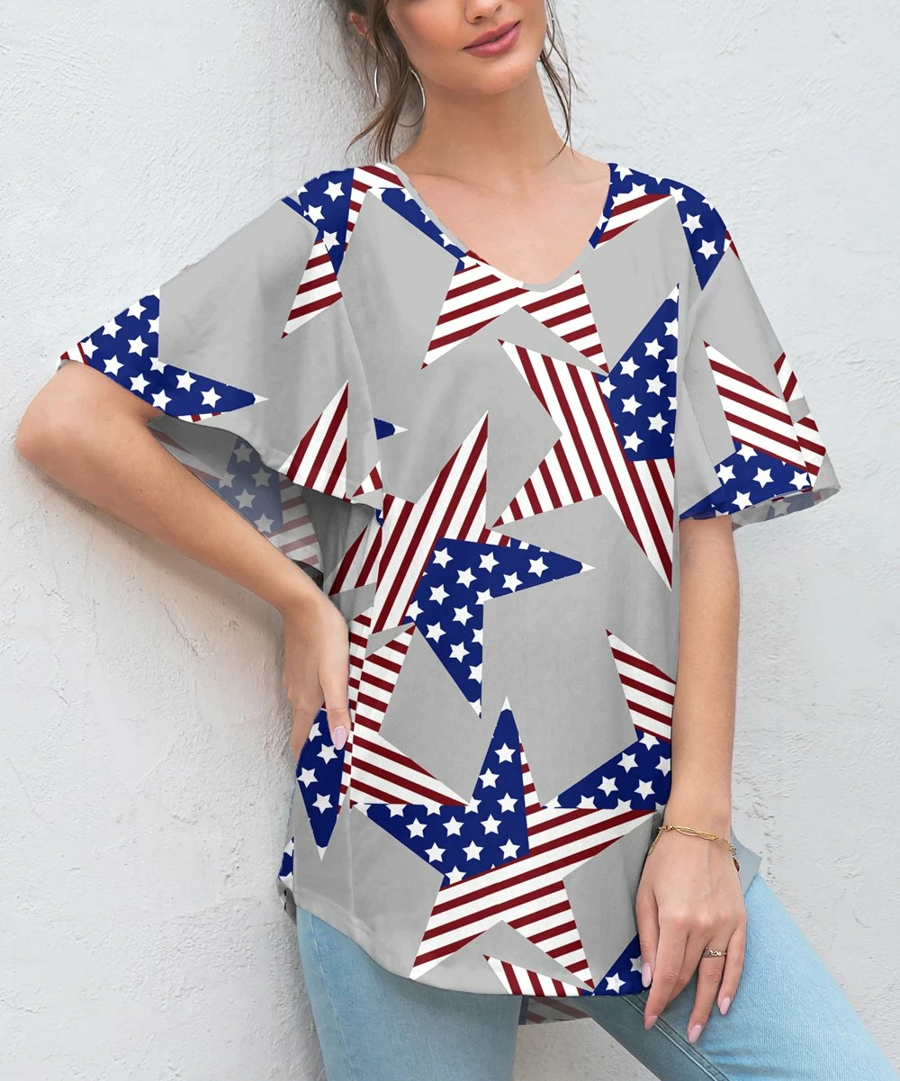 Dramatic bell sleeves skim just above the elbows lend movement and fun to this v-neck tunic that splashes your look with an eye-catching print.