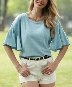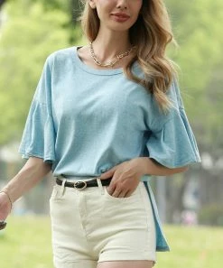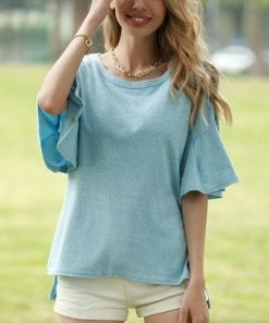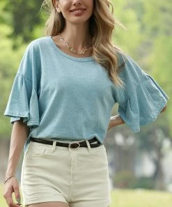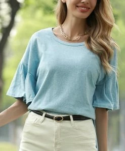 Show off a playful sense of style in this soft-hued tunic flaunting elbow-length bell sleeves and a scoop neck.