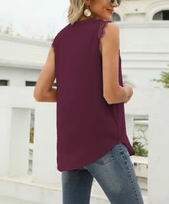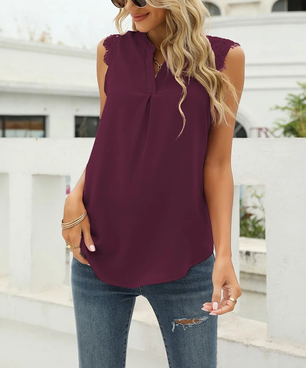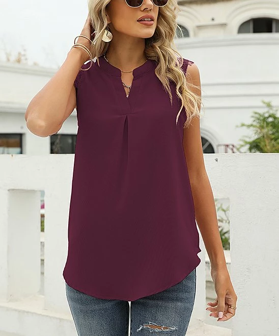 Bring a cool and sophisticated touch to your sunny-day looks with this lightweight notch-neck top completed with a lace-accented sleeveless design.