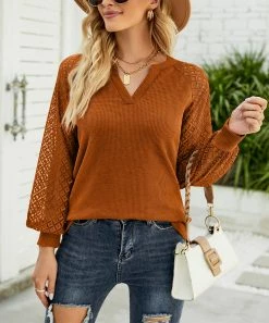 Long-sleeve tunic with a flattering V-neckline and lace-accented sleeves.