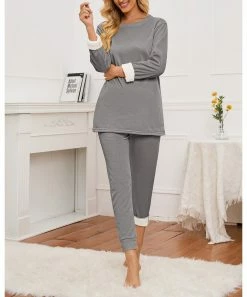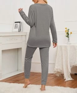 - Includes gray long-sleeve top and matching lounge pants (two pieces total)