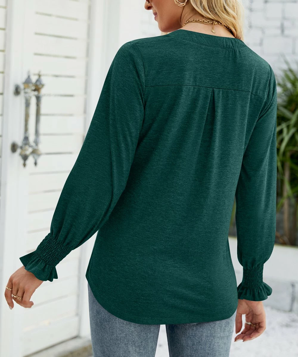 Go for a casually poised look in this cotton-blend top featuring long sleeves with smocked cuffs and a notched neckline.