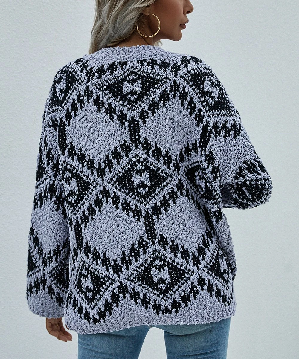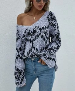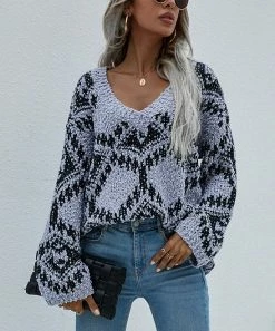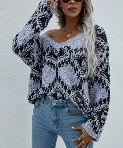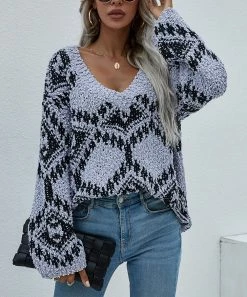 Slouchy v-neck sweater featuring long sleeves and a relaxed fit.