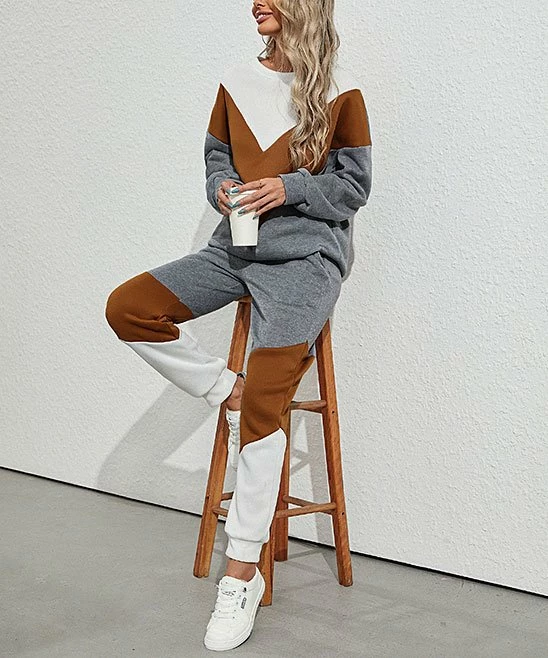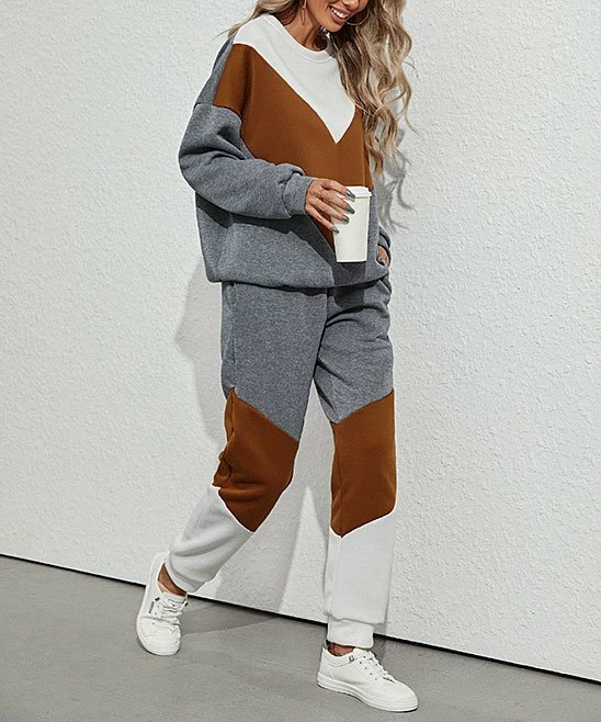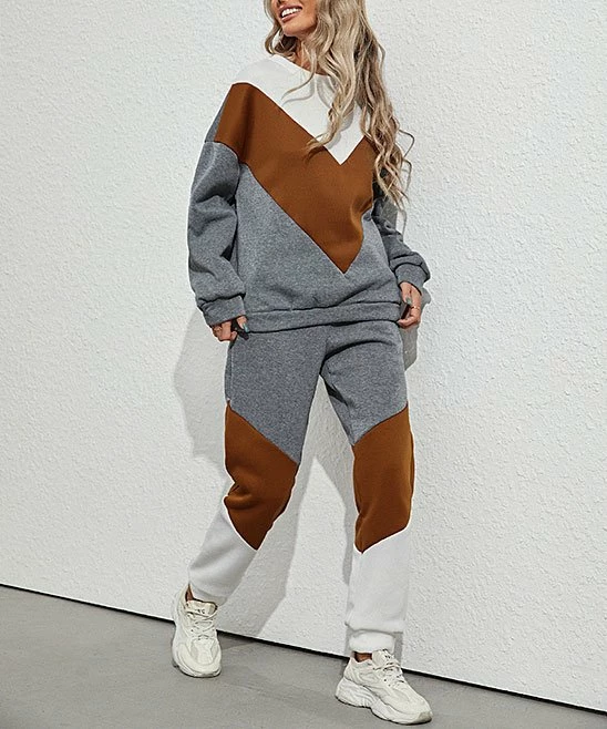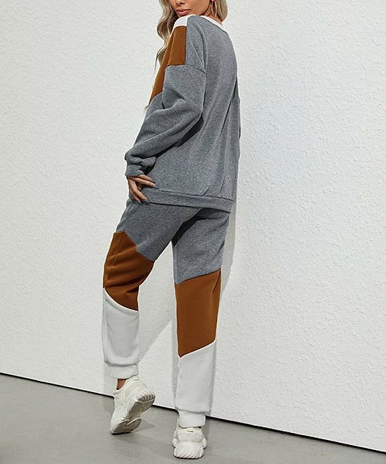 - Includes one gray color block sweatshirt and one pair of gray color block sweatpants (two pieces total)