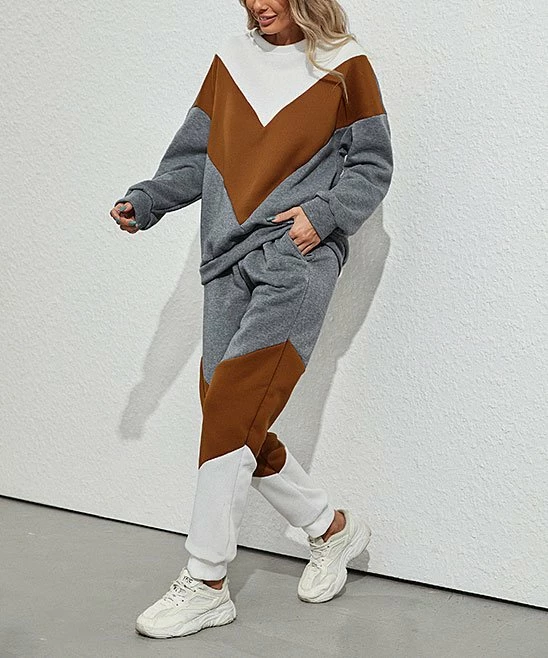 You don’t have to sacrifice comfort for style when you’re wearing this lightweight loungewear set featuring a color block chevron design.