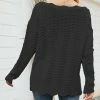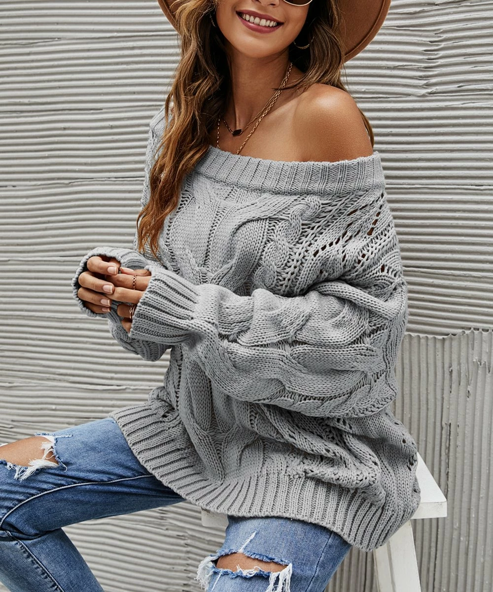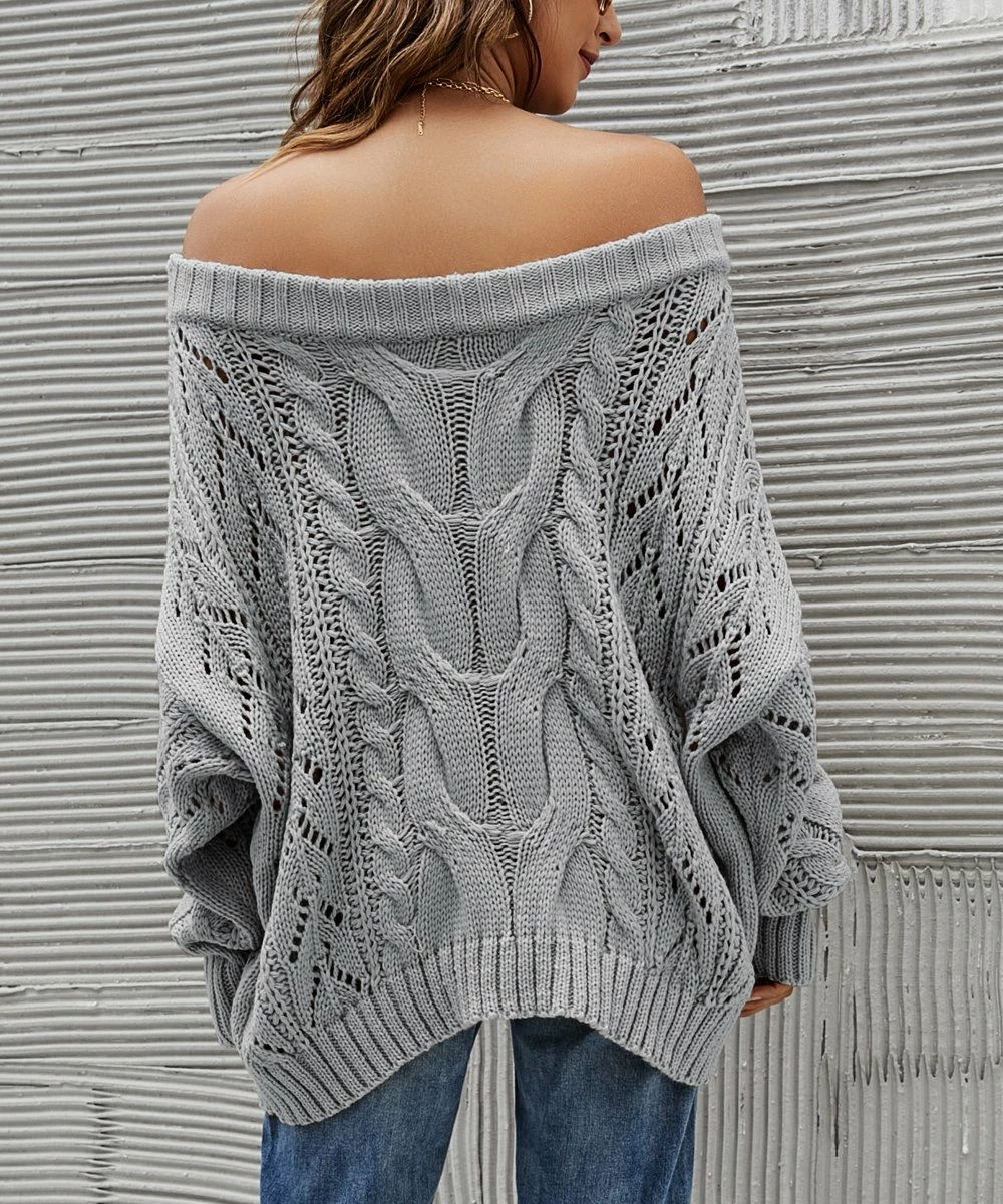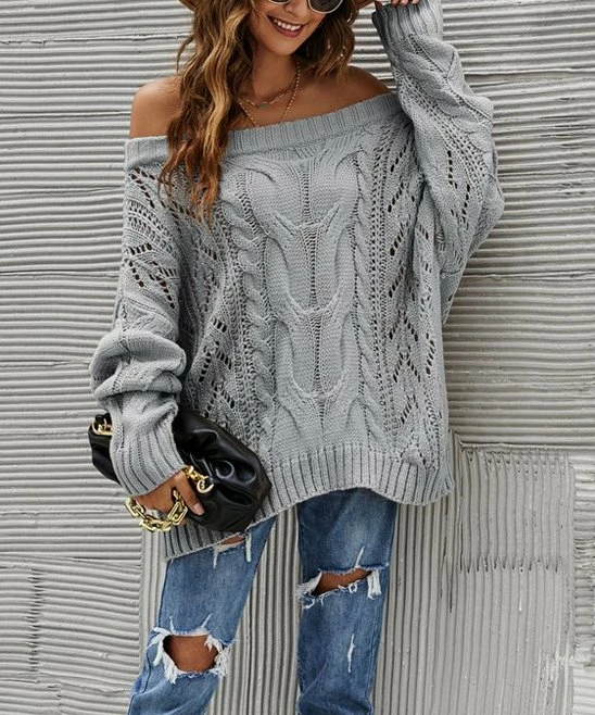 Solid-color cable-knit sweater featuring long slouchy sleeves and an off-shoulder design.