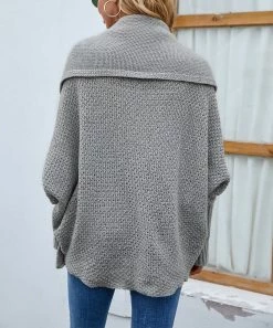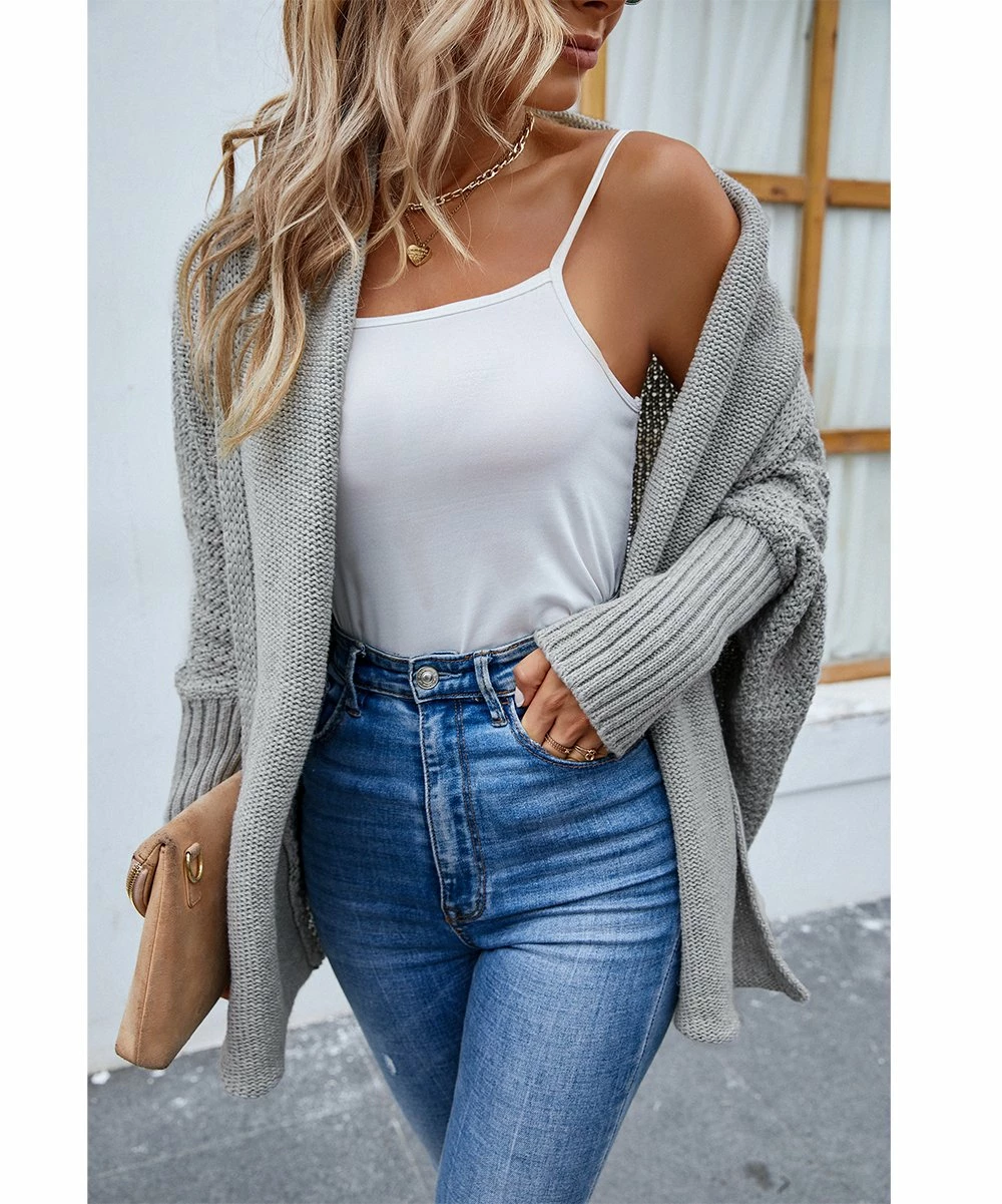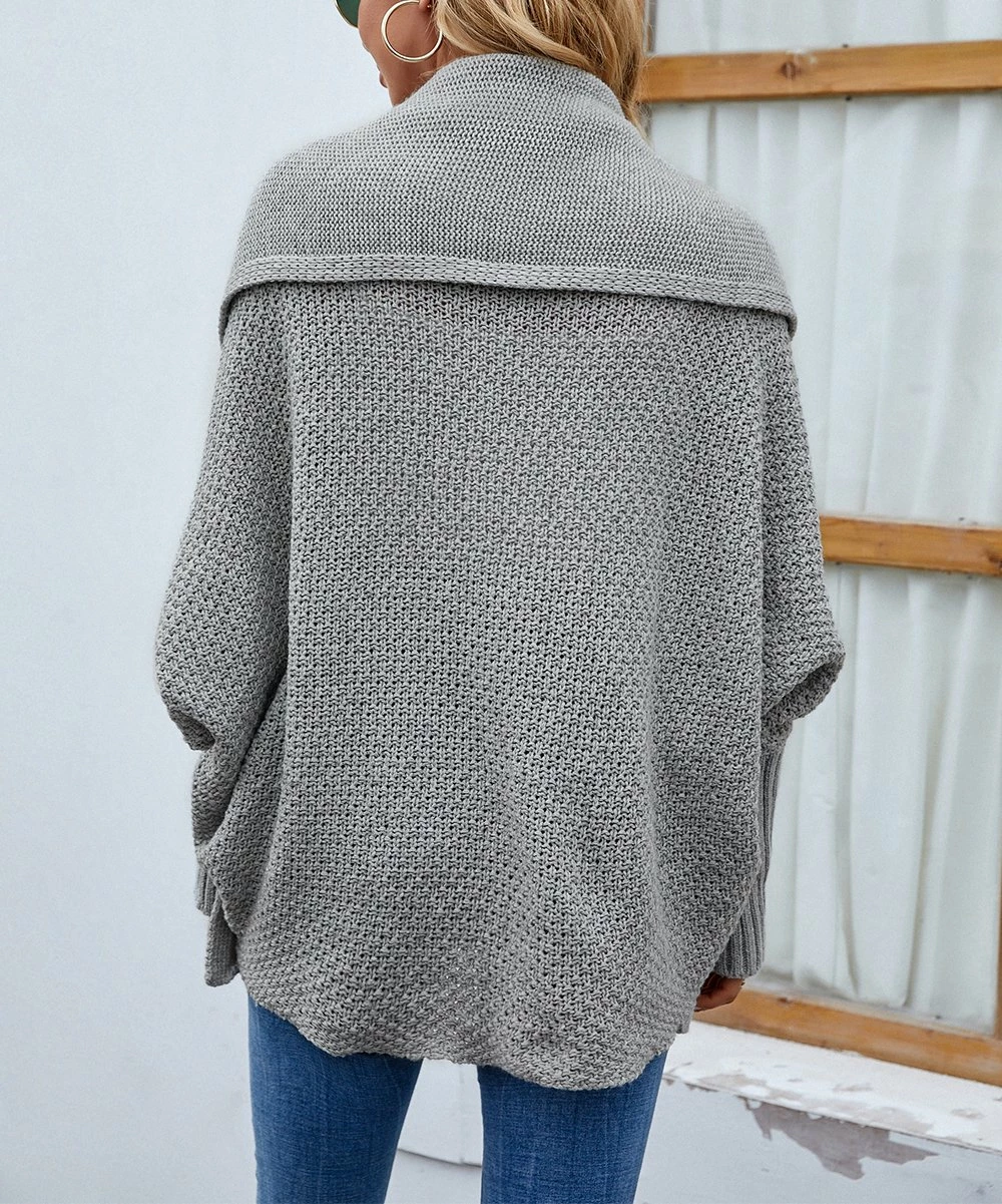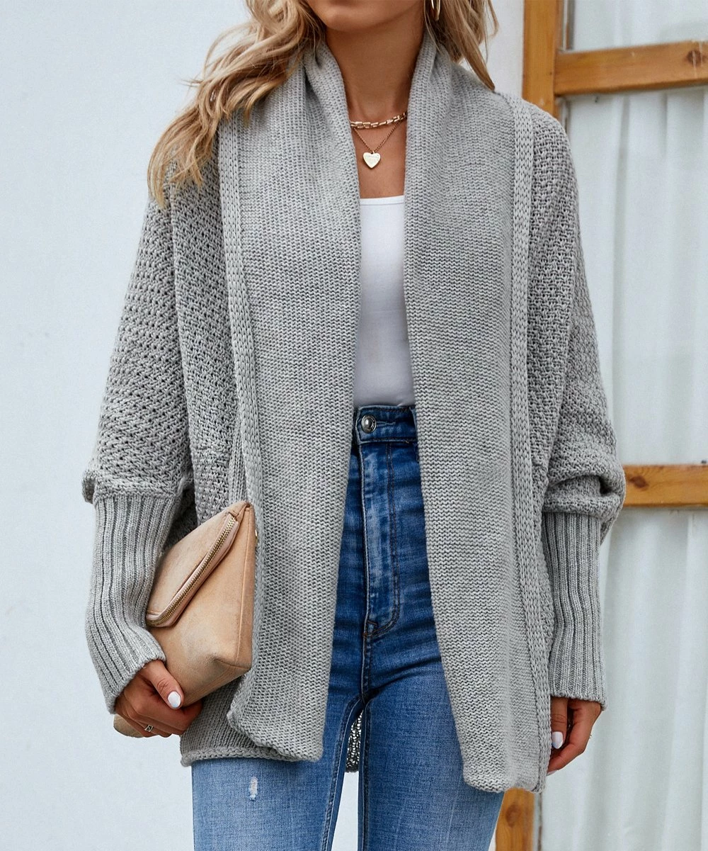 Open cardigan featuring a ribbed knit, flowy shawl collar and long dolman sleeves.