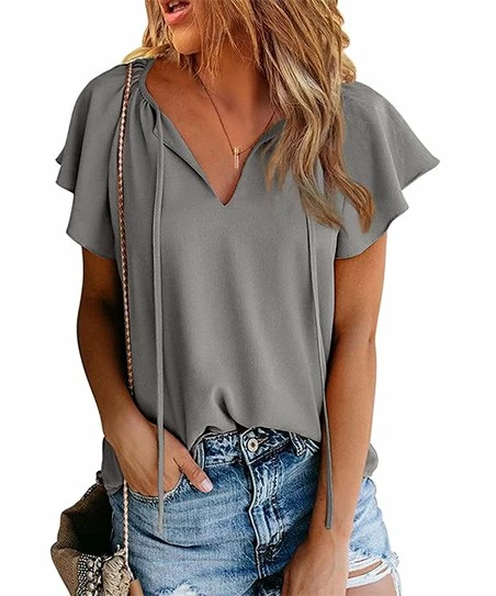 Lace-up short-sleeve top featuring a solid, easy-to-pair hue and plunging v-neckline. Stretch-infused fabric.
