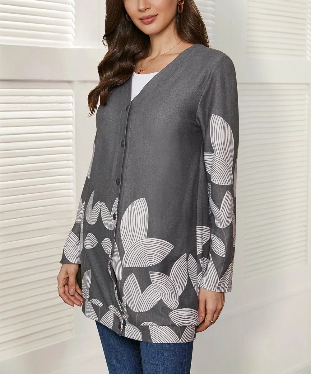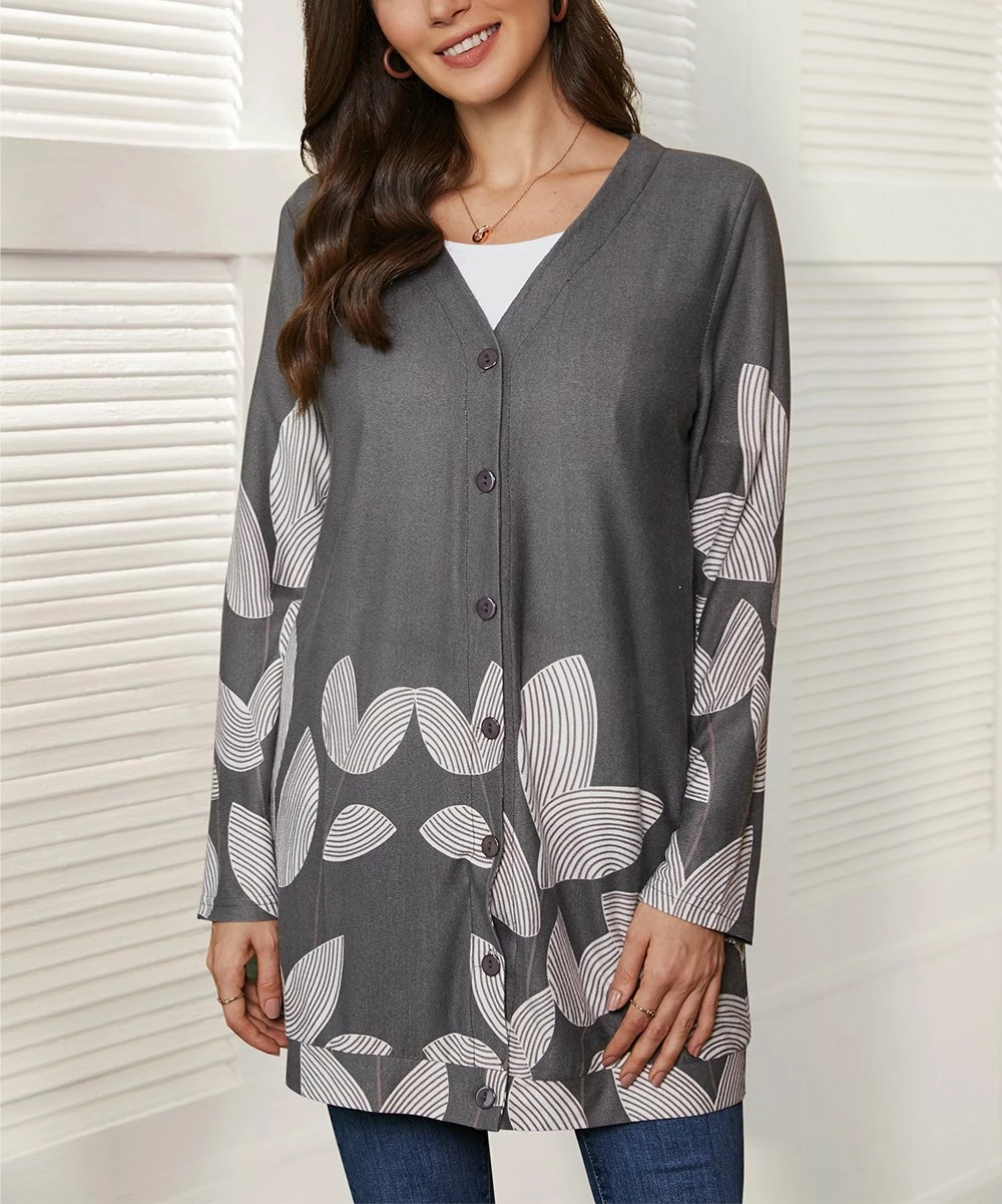 This longline cardigan features a flattering v-neckline, button-up front and bold leaf pattern.