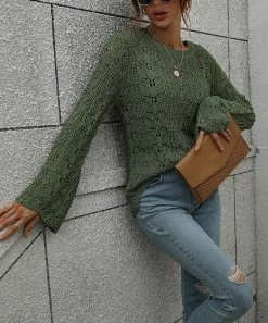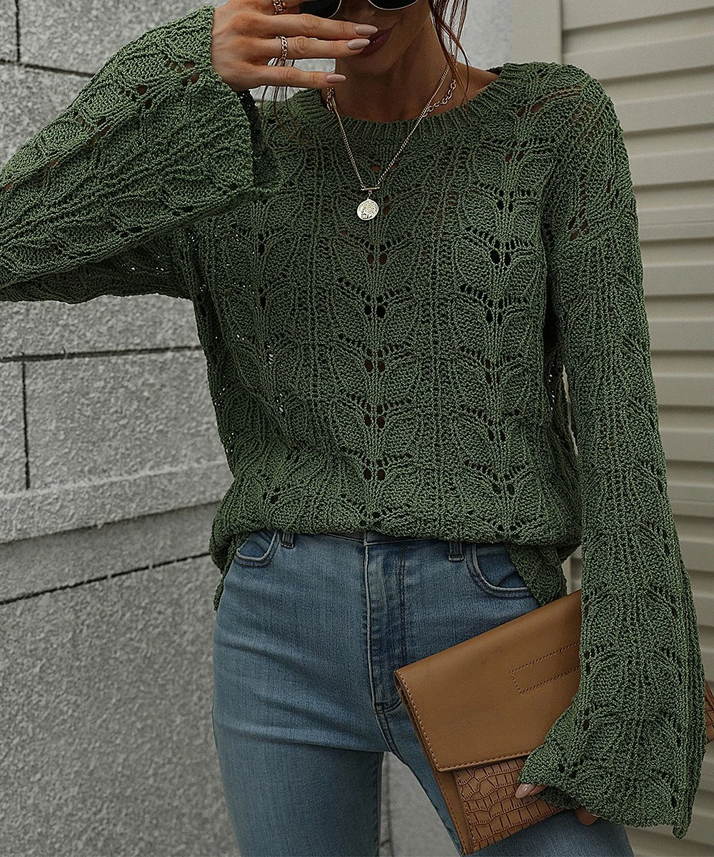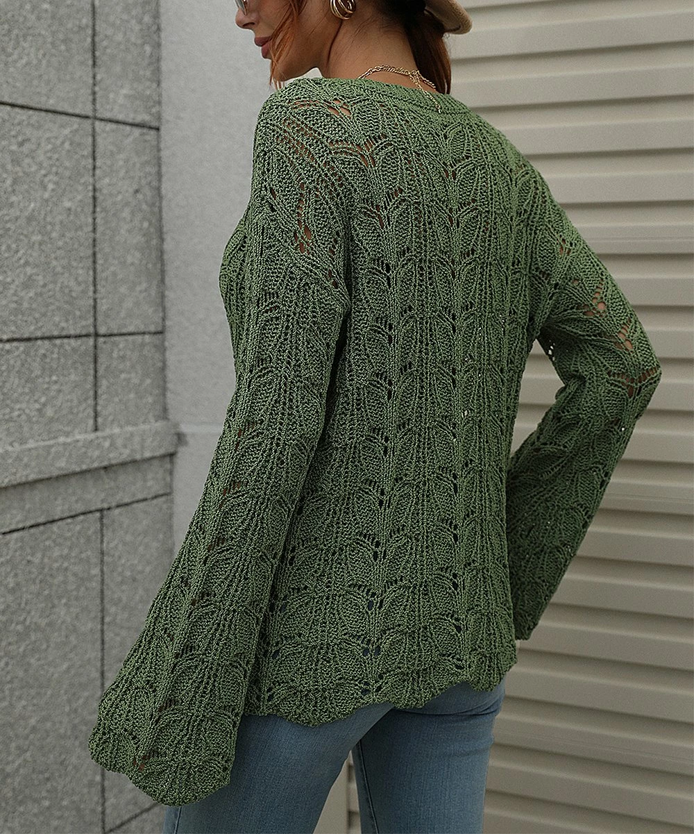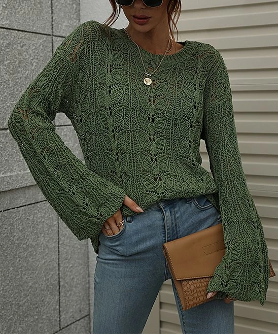 Stay cozy any time of day with this pointelle-knit sweater presenting bell sleeves and scalloped trim.