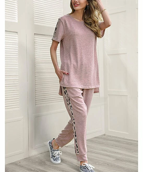 - Includes heather pink leopard side-slit hi-low tunic and joggers (two pieces total)