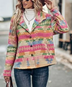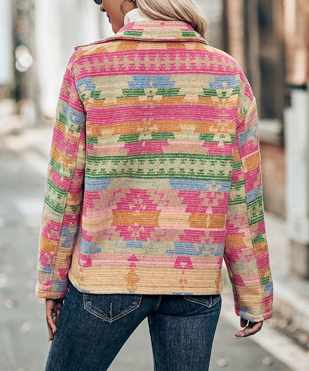 Button-up jacket featuring a soft cotton blend with geometric pattern.
