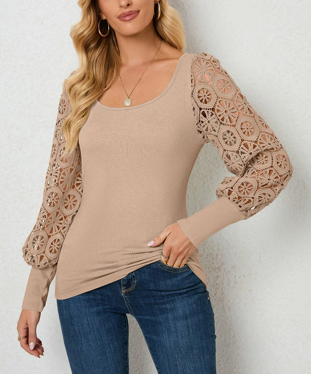 This elegant top offers lacy balloon sleeves and a scoop neckline.