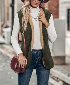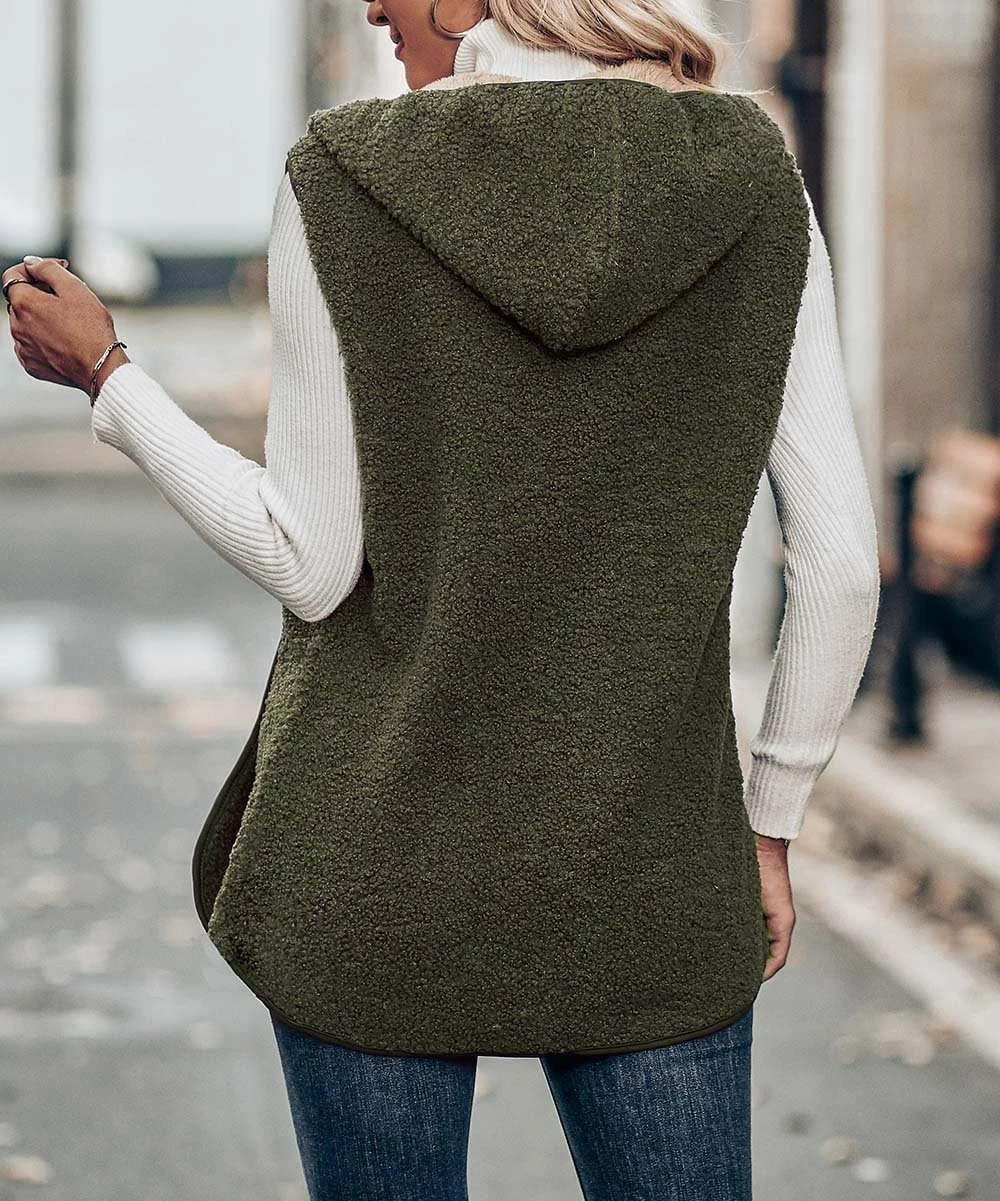 This lightweight, fuzzy vest features a slouchy hood and eye-catching color contrast on the reverse side.