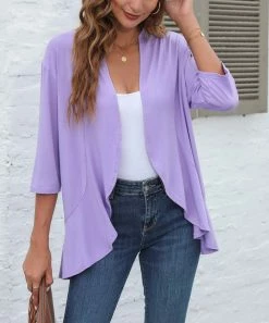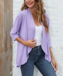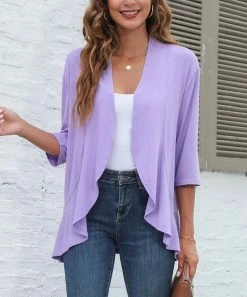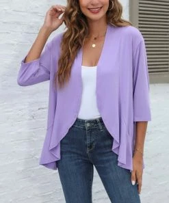 Layer your look with this rayon-blend cardigan featuring three-quarter sleeves and a flowy flounce hem.