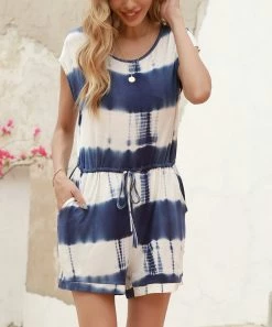 Make the most of sunshiny days in this casual short-sleeve romper flaunting a carefree tie-dye motif, back keyhole button closure and cinched-in drawstring waist.