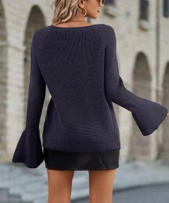 This dramatic trumpet sleeve sweater cuts a versatile and stylish look with jeans, skirts or pants.