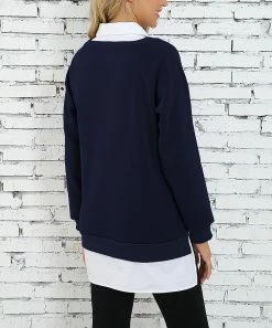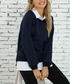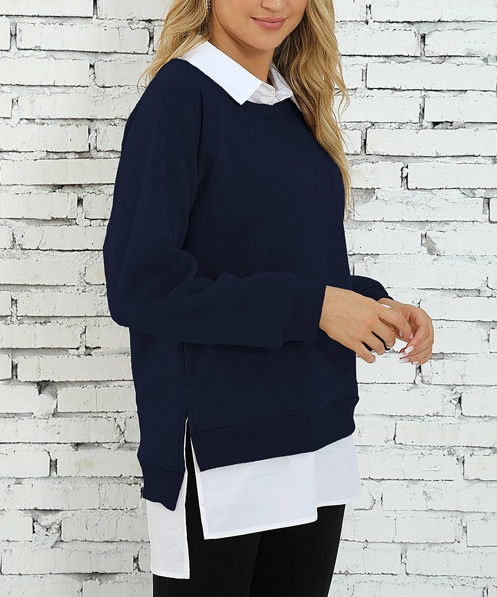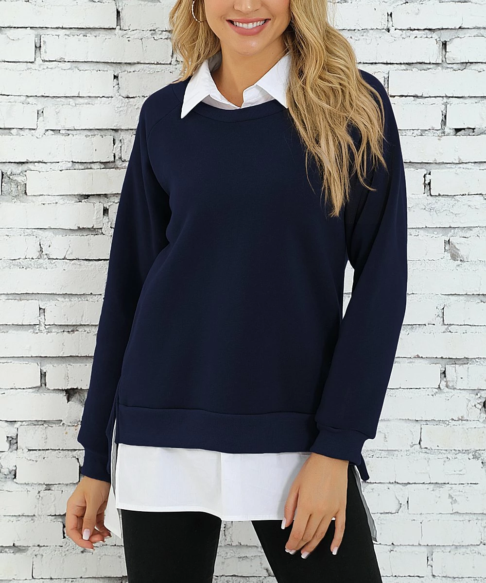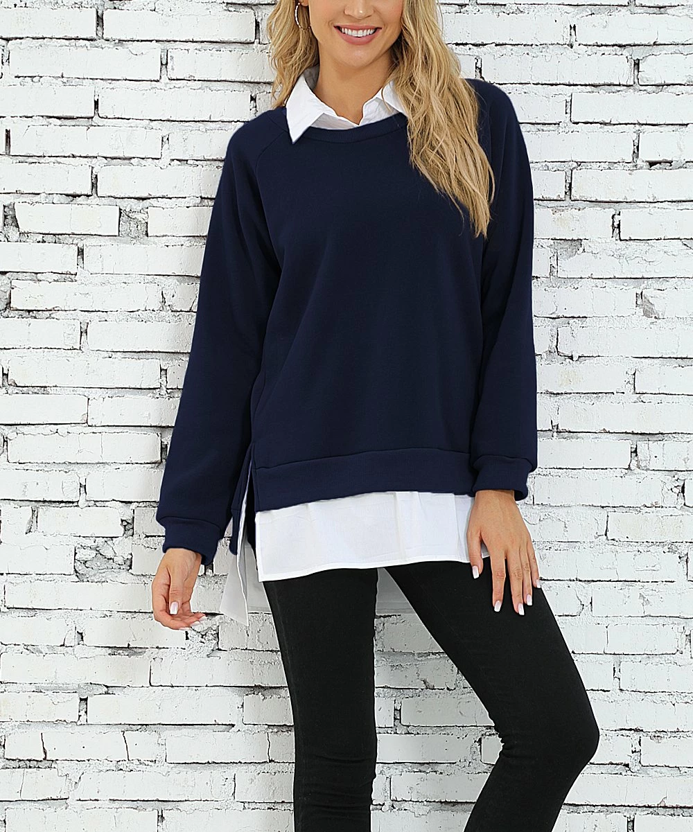 Achieve a classic prep look with this cozy layered-look sweatshirt that pairs great with leggings or your favorite jeans.