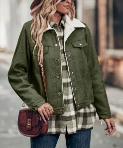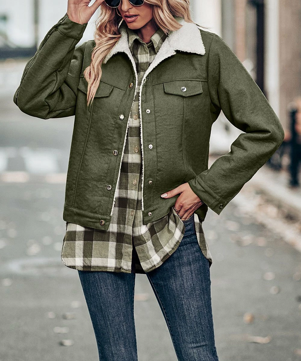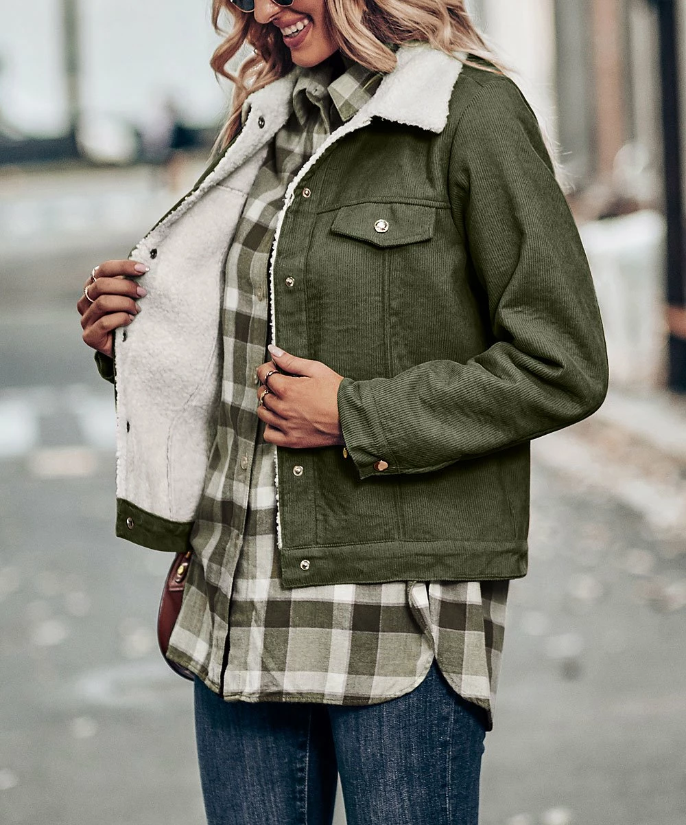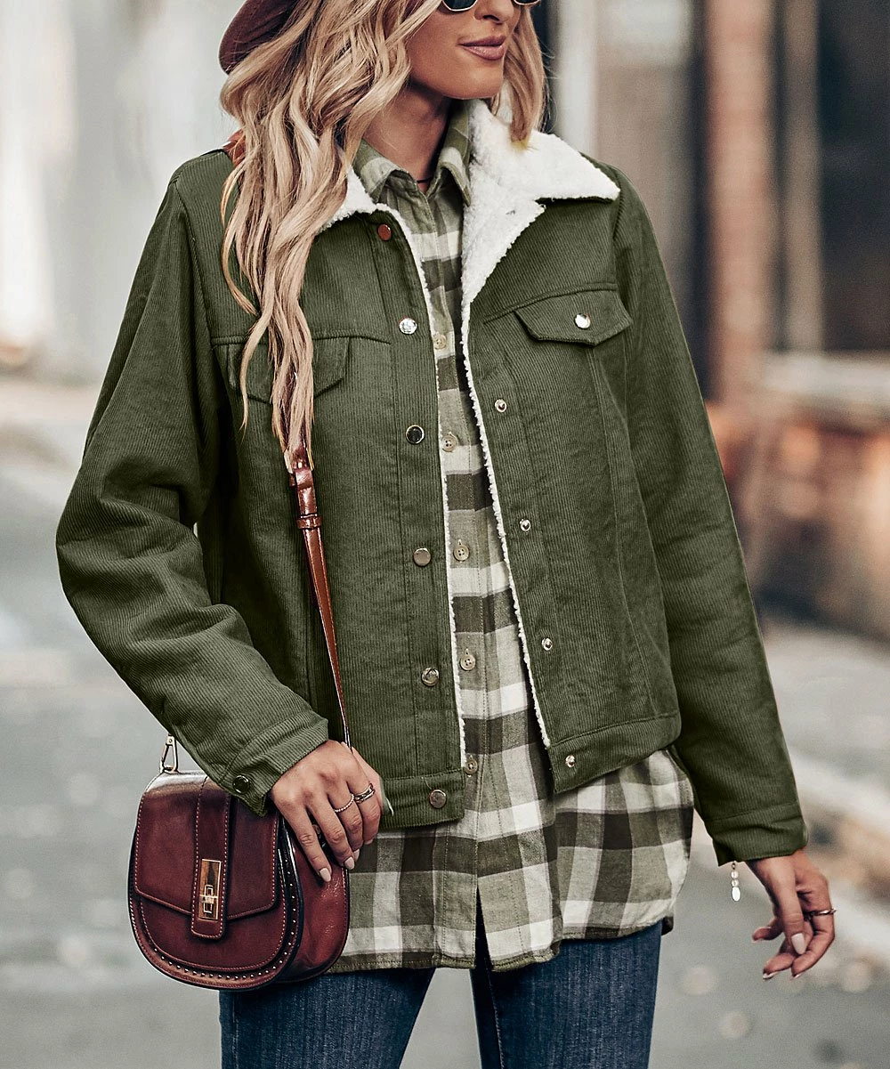 Corduroy button-up coat featuring a corduroy outer and warm sherpa lining.