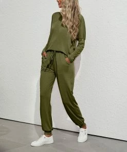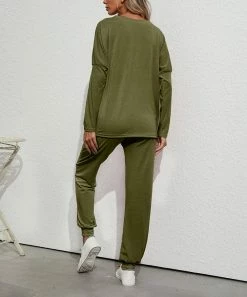 - Includes olive long-sleeve tee and olive joggers (two pieces total)