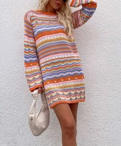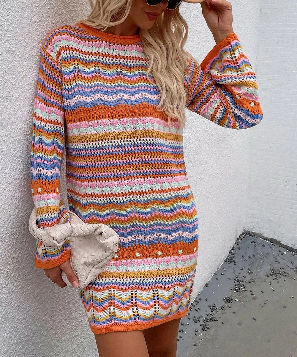 A longline design and allover geometric striped pattern give this cozy sweater a bohemian appeal.