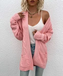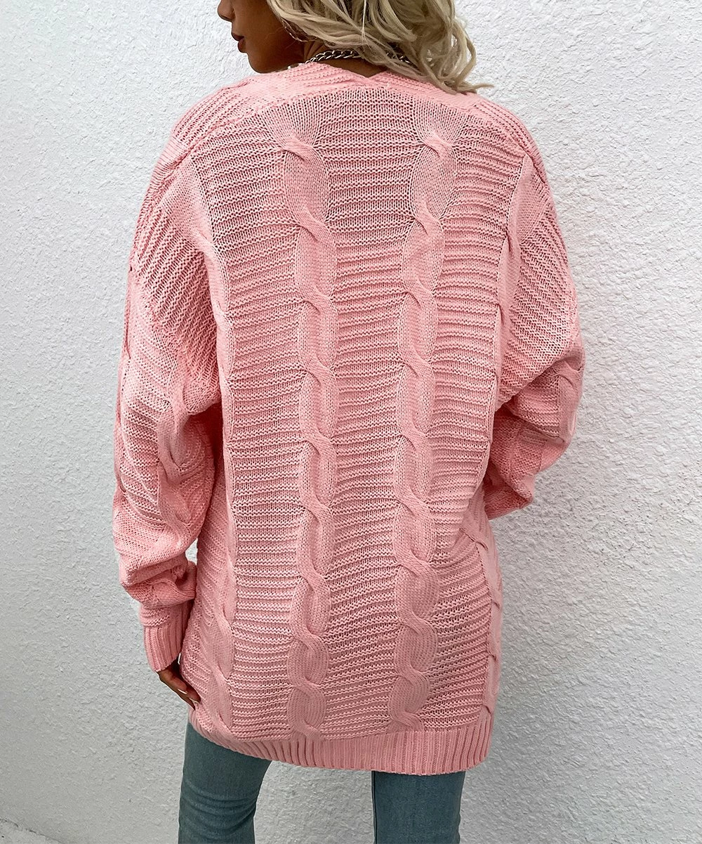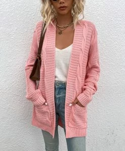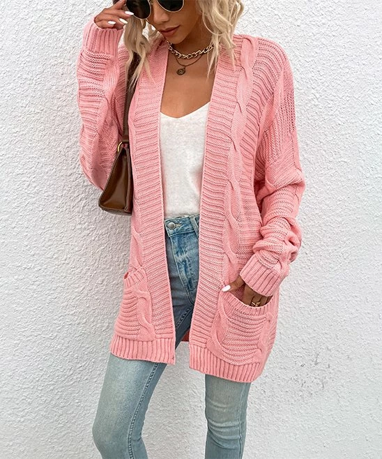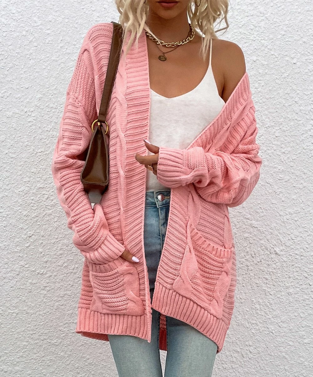Casual solid-color open cardigan featuring a cable-knit design and front pockets.