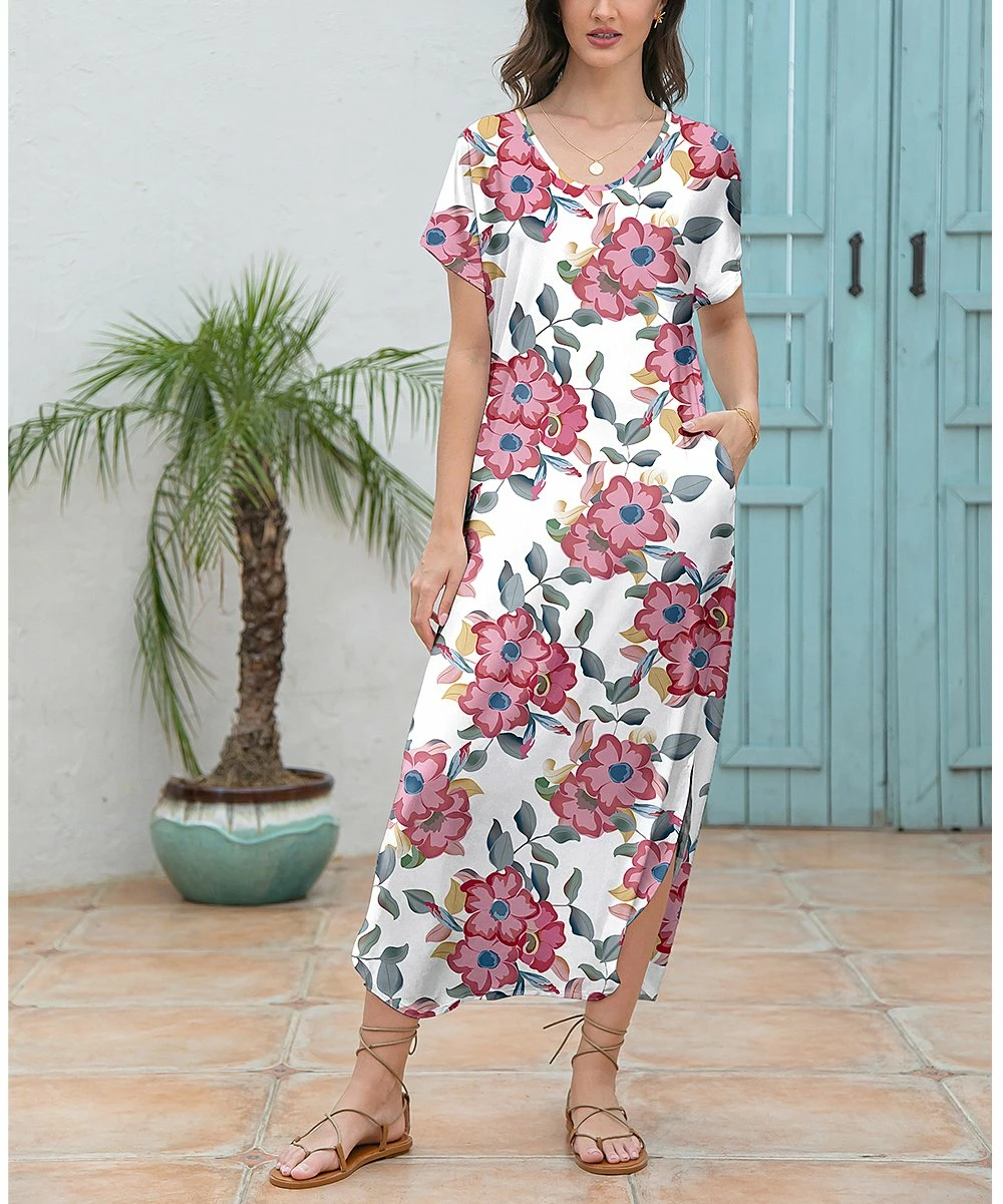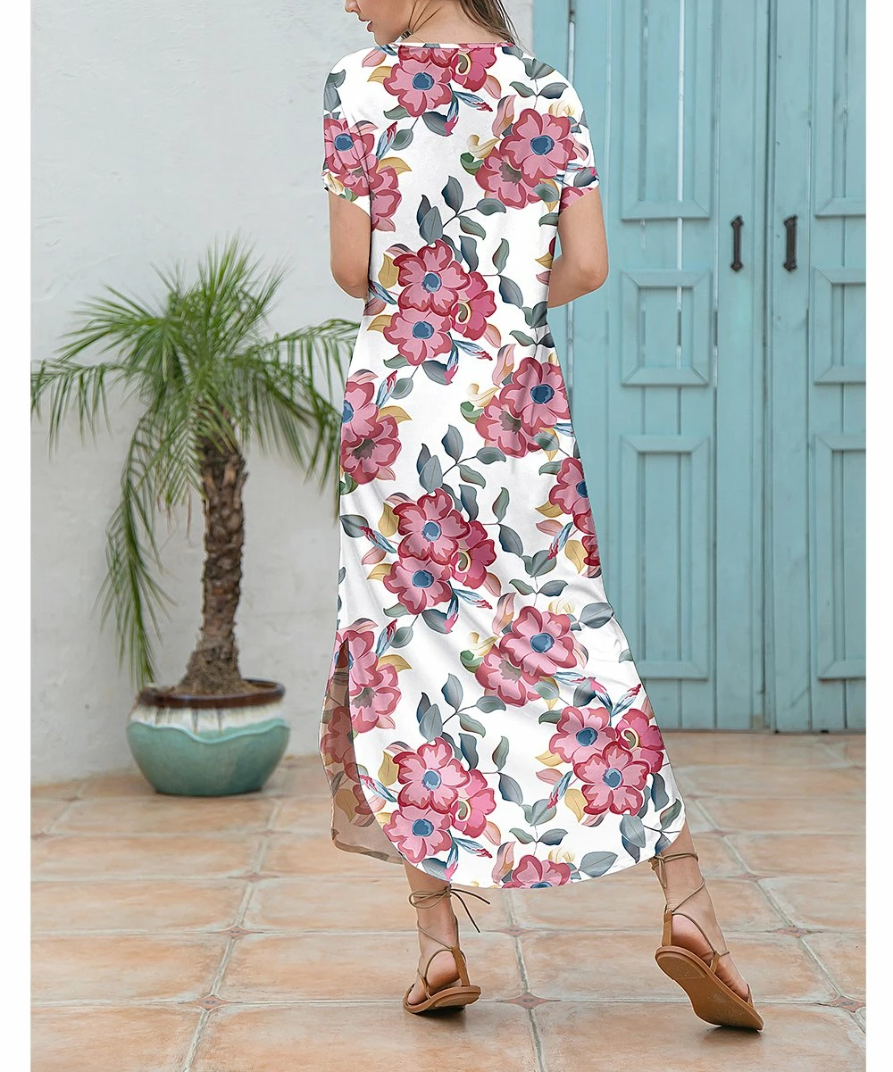 Bring new life to your casual wardrobe with this stretch-imbued midi dress outfitted with subtle side-slit details and a bold floral print for a vacay-ready look.