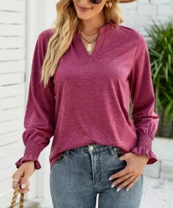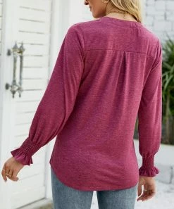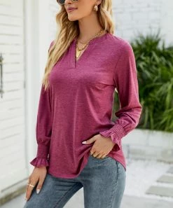 Opt for casual poise in this cotton-blend top featuring a notched neckline and smocked detail finishing the long sleeves.