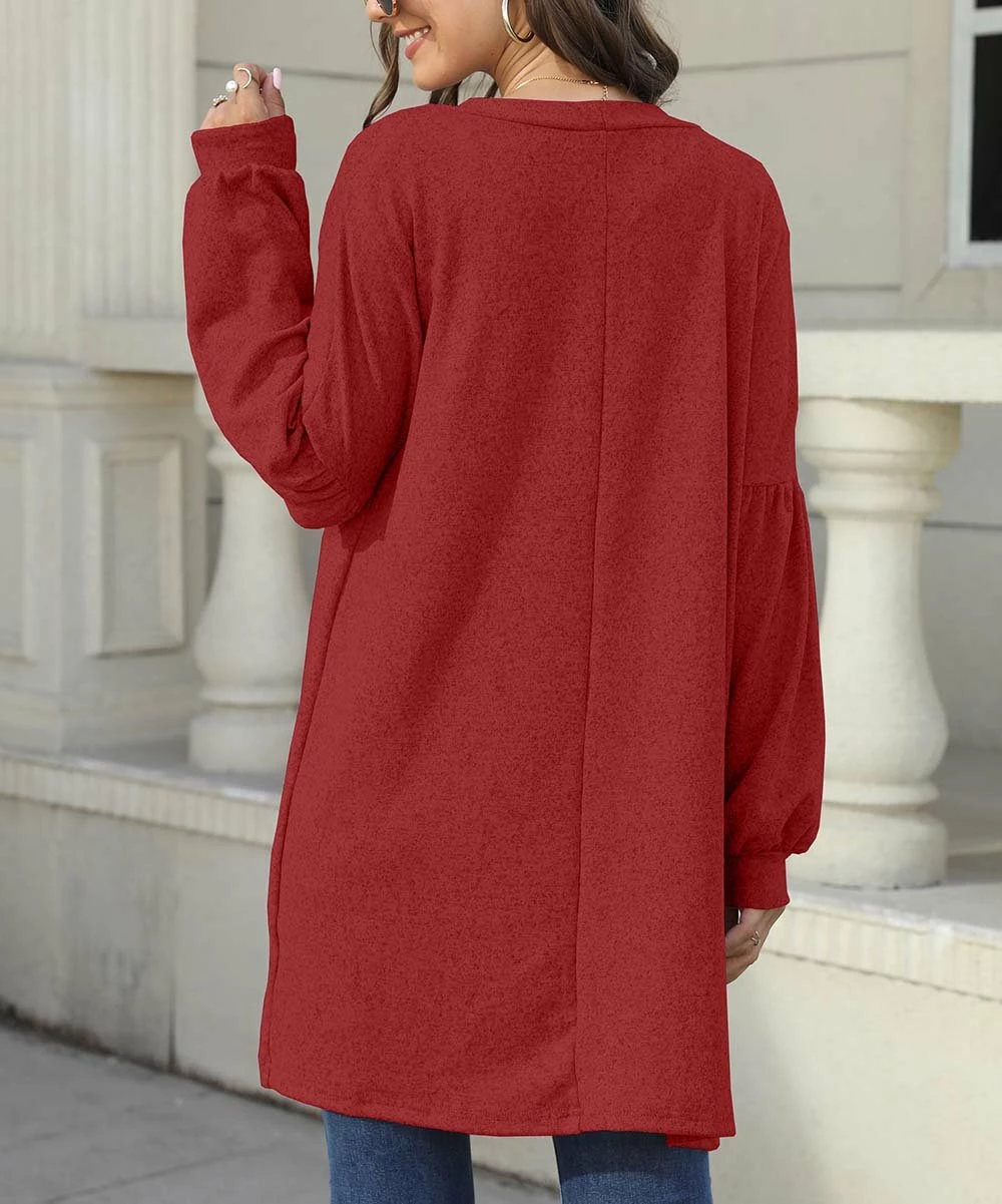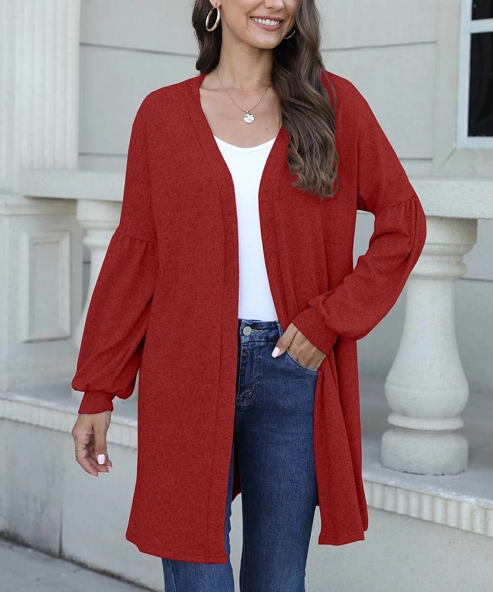 Bolster your layer collection with this carefree open cardi featuring puff sleeves and a soft cotton-blend fabric for easygoing wear.