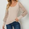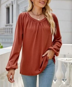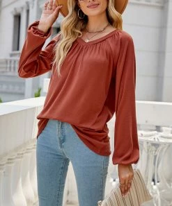 Monochromatic V-neck top with slightly puffed long sleeves.