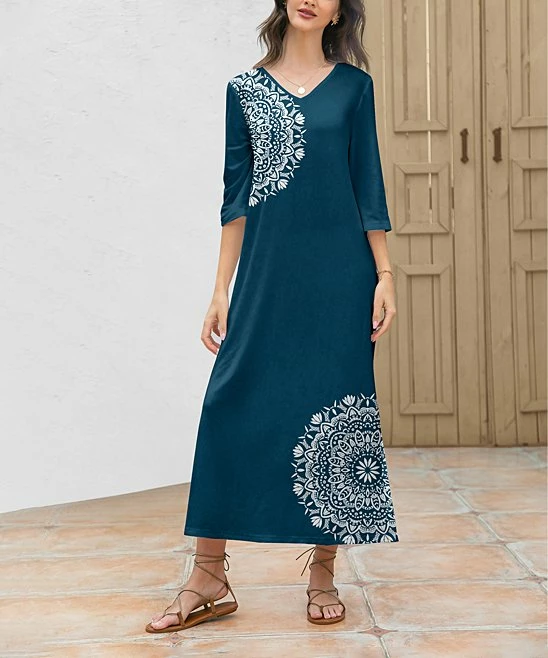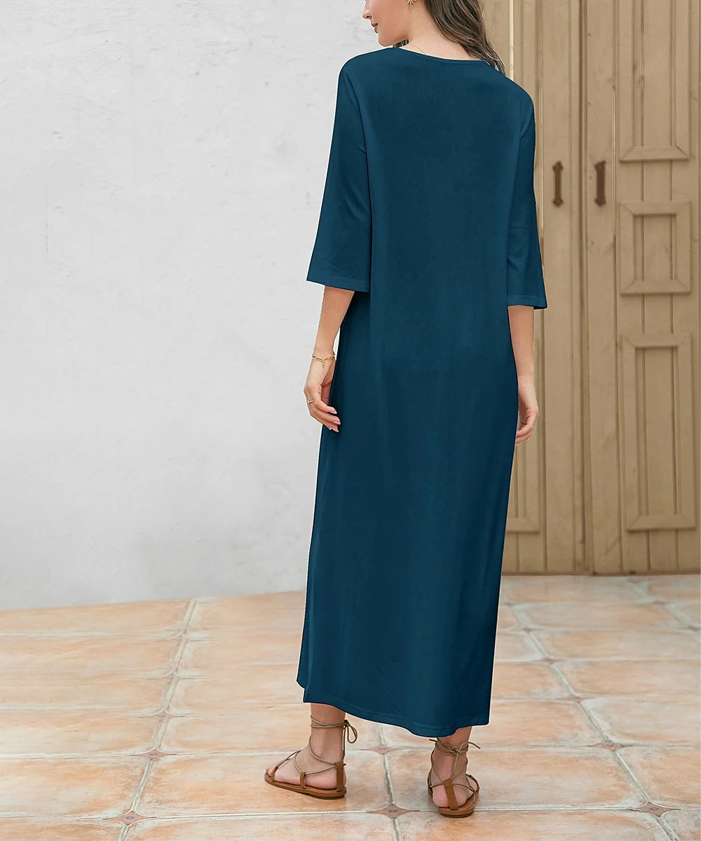 Show your spirited style wherever you go with this playful three-quarter sleeve maxi dress.