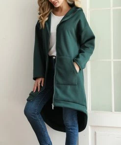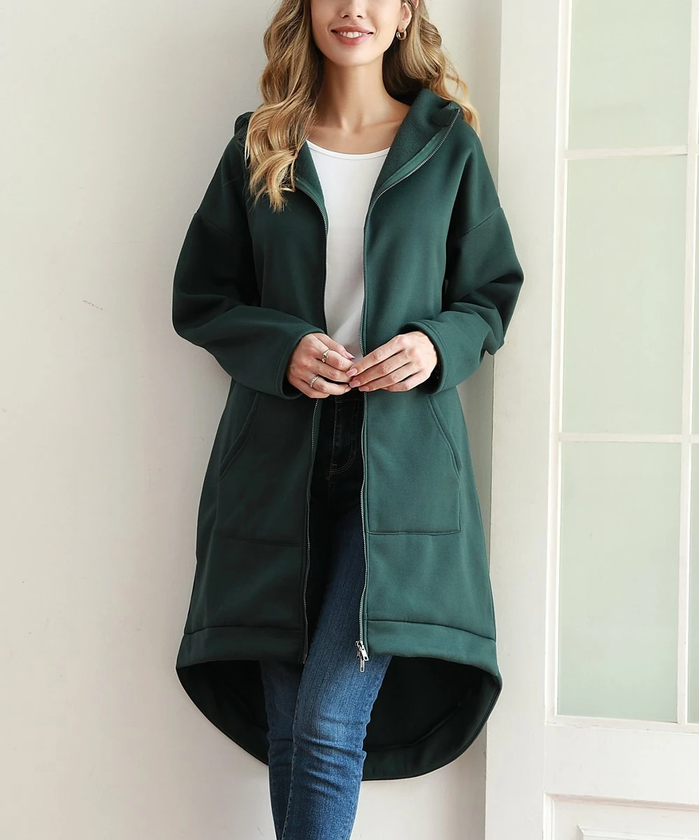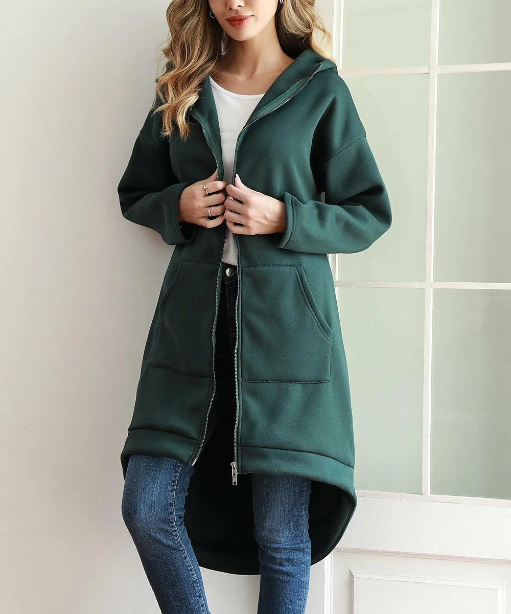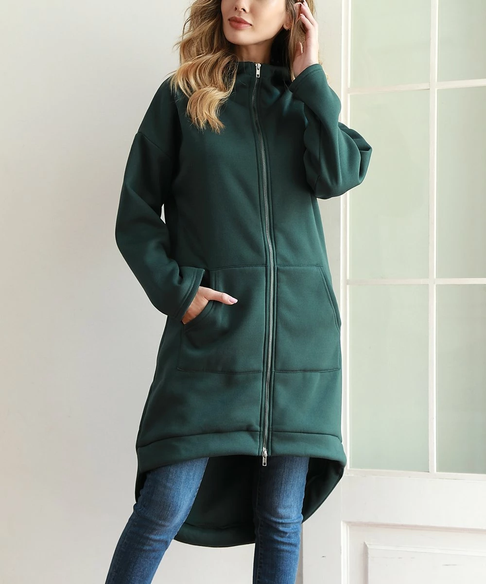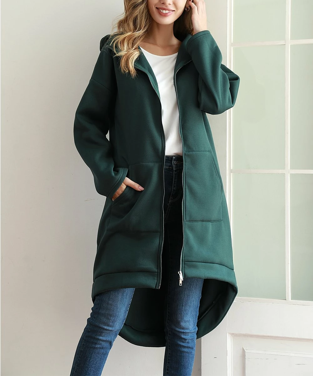 Add an everyday essential your your chilly-climate collections with this long and cozy hoodie fashioned with handy front pockets and a flowy asymmetrical hem.