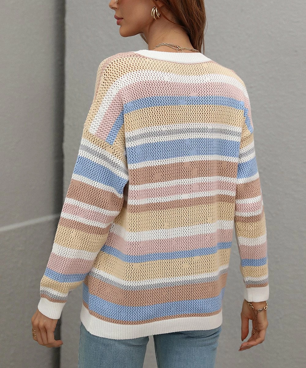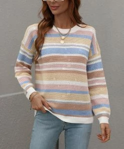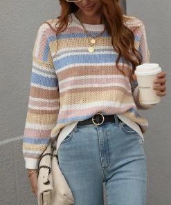 Casual striped crewneck sweater featuring long sleeves and a muted palette.
